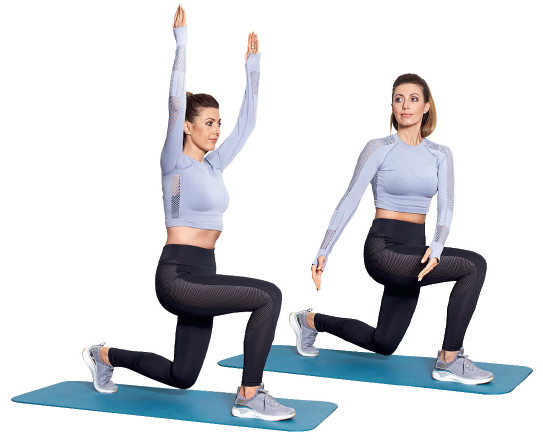 Как выполнять: Поставьте стопы в сплит-положение на расстоянии обычного шага (стопы параллельны, правая впереди, левая сзади) и поднимите руки над головой, не поднимая плеч. Сделайте приседание, сгибая оба колена на 90 градусов, одновременно вращайте торс вправо. Руки двигаются за правое бедро, правое колено над пяткой. Повторять в медленном темпе 15 раз, после чего такой же подход сделать на левую ногу.