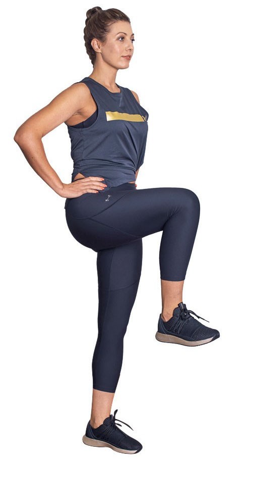 2-3. Вытяните руки перед собой, затем согните в локтях. Большие пальцы направлены вверх. Меняйте ноги и возвращайтесь в исходное положение. Не задерживайте дыхание.