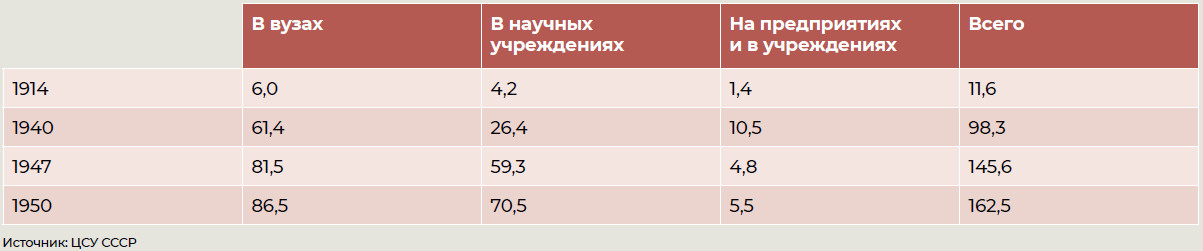Общее число работников сферы науки (включая обслуживающий персонал научных организаций) составляло на 1940 год 362 тыс. человек, или 1,1% всех рабочих и служащих. После спада к 1945 году их число восстановилось и к 1950‑му удвоилось до 714 тыс. (1,8% от числа всех работников).