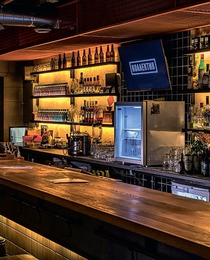 Полусекретный бар скрывается за дверью с надписью «Подарки к праздникам!». «Коллектив» обошелся без характерной для спикизи стилизации под богемные 1920-е – простой, почти голый зал с отливающими металлом стенами. Интерьер тут второстепенен, главное – коктейли, над которыми колдует команда лучших барменов города.