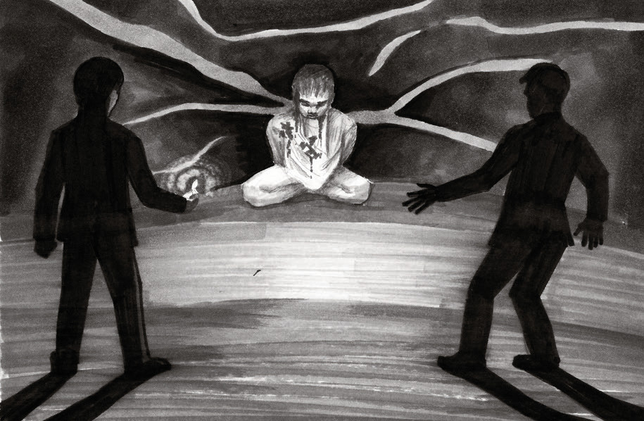 Петя поворачивает назад и видит слева от входа еще один ход. Он пробирается в него и зажигает вторую спичку. Прямо перед Петей на расстоянии вытянутой руки – фигура в белой рубашке.