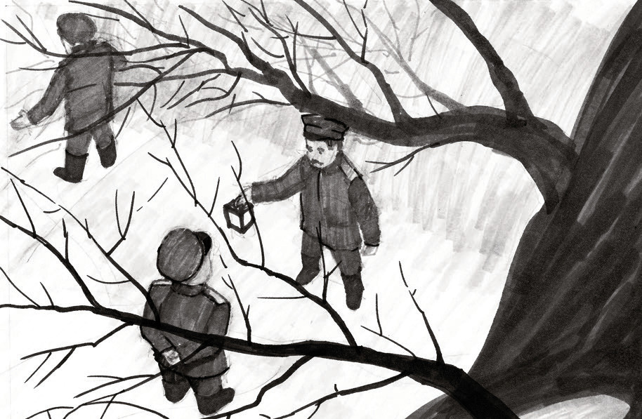 Мальчики останавливаются перед высоким деревом, прямо под ним чернеет вход в пещеру. С обнаженных корней дерева капает талая вода, перед пещерой чудом уцелевший сугроб. Елащинский ловким тычком «забивает» шишку в «ворота».