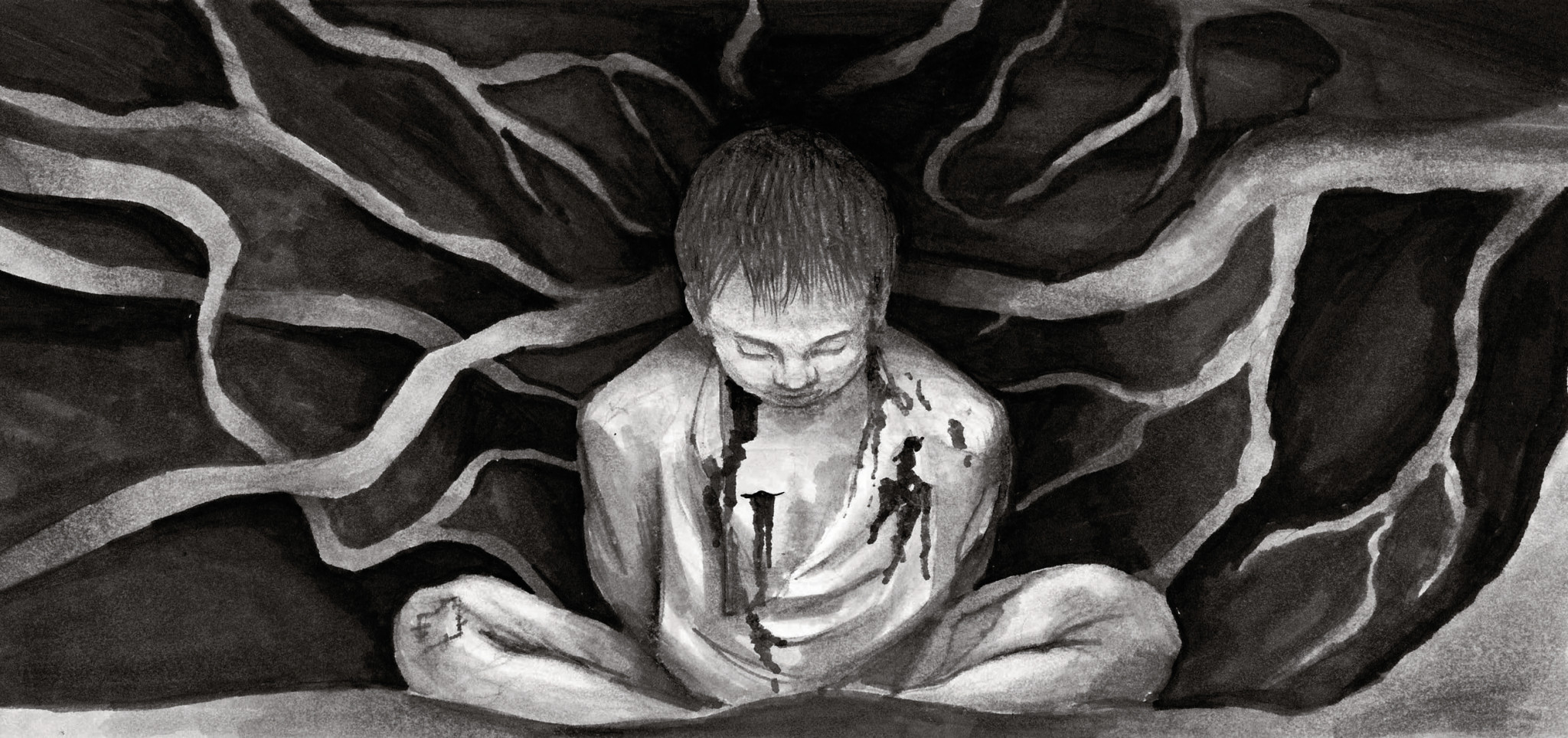 Рапота пробирается в глубь пещеры. Под ногами хлюпает талая вода. На земле лежат какие-то тряпки. Вдруг свет стеариновой свечи выхватывает фигуру ребенка в белой рубашке. Он неподвижно сидит с опущенной на грудь головой, поджав под себя голые ноги. На белой рубашке темнеют следы засохшей крови и глины.