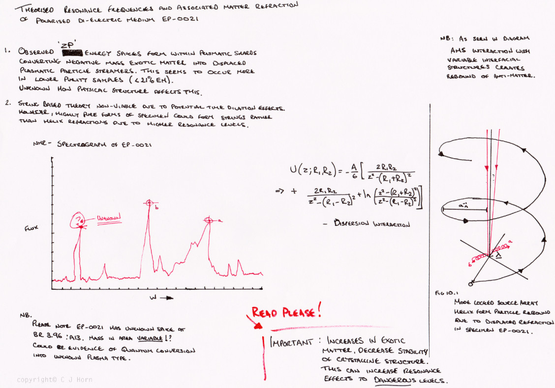 Здесь мы видим дополнительные сведения о EP-0021. Физики, исписавшие ее, докладывают о возникновении стримеров, то есть разрядов, представляющих собой плазменные трубки, вследствие вспышек нулевой энергии. Ученые связывают их появление с воздействием отрицательной массы и отмечают, что такое встречается и в менее чистых (<21 процента экзотической материи) образцах, но не знают физического механизма, лежащего за этим явлением. График ниже представляет собой ЯМР-спектр образца, с отмеченным на нем аномальным резонансом.