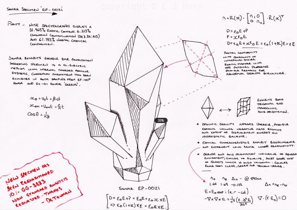 Слева мы видим заметки физиков о результатах ЯМР-исследований образца, а также можем узнать, что все схожие образцы светятся зеленым светом из-за черенковского излучения (+ несколько формул из Википедии). Заметки говорят, что образец почти на 32 процента состоит из экзотической материи с отрицательной массой, а также является поляризованным диэлектриком с системой зарядов внутри (вероятно, речь идет о сегнетоэлектрике). Из надписей мы также можем узнать, что кристалл демонстрирует моноклинную и тригональную сингонии, благодаря чему обладает двойным лучепреломением (соответствующие формулы прилагаются). Мы даже можем сказать, что обыкновенный и необыкновенный показатели преломления кристалла равны 1,65 и 1,49, соответственно.