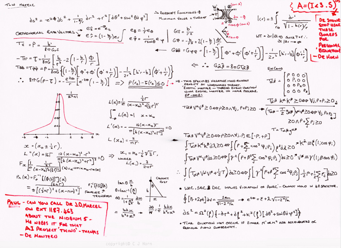 Кротовая нора на доске — проходимая. Выкладки физиков начинаются с введения метрического тензора, выраженного в координатах Шварцшильда, для червоточины Морриса — Торна. Вывод совпадает с тем, к чему пришли Моррис и Торн в своей оригинальной статье. Физики из Черной Мезы также заключают, что для образования проходимой червоточины требуется экзотическая материя с отрицательной массой, поскольку только она сможет удержать горловину кротовой норы от коллапса. С построчным разбором выводов на этой доске вы можете ознакомиться в блоге физика и математика Самуэля Лереа.