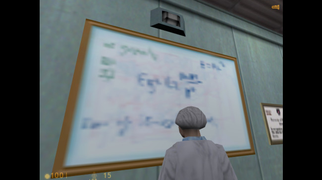 Но, строго говоря, интерьеры Черной Мезы были далеки от настоящих физических лабораторий. Особое умиление у разбирающихся в физике игроков вызывали маркерные доски, висящие на стенах. Такие доски действительно есть почти в каждой лаборатории, однако их содержание в Half-Life выглядело нелепо. Угловатые NPC в белых халатах больше были похожи на семиклассников — одни задумчиво рассматривали формулу ньютоновского тяготения, другие глубокомысленно взирали на эйнштейновское выражение для эквивалентности массы и энергии.