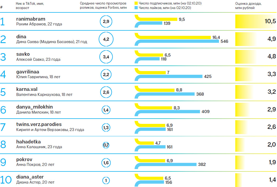 На втором месте «королева TikTok» — таджичка Дина Саева, абсолютный лидер русскоязычного сегмента видеосервиса по числу подписчиков, за ее жизнью наблюдают более 16 млн пользователей. На третьем — белорус Алексей Савко с 6,5 млн подписчиков, который зарабатывает не только на рекламе, он продает обучающие курсы и онлайн-консультации по продвижению в TikTok, занимается продюсированием начинающих блогеров и строит актерскую карьеру.