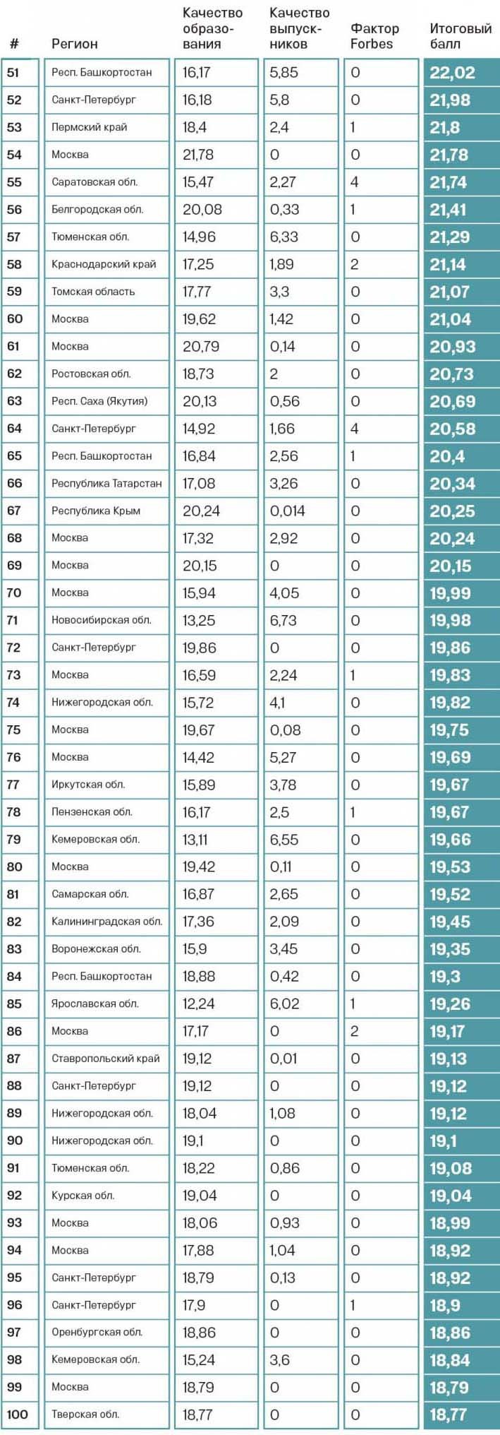 Кроме того, мы решили провести свое исследование и выяснить, выпускников каких вузов больше всего любят работодатели. Именно из их ответов мы сформировали обновленную метрику «Качество выпускников» (30 баллов). Совместно с сервисом «Авито Работа» мы направили запросы в 127 крупнейших компаний и попросили ответить на три вопроса: «Выпускников каких вузов вы наняли в 2019–2020 годах?», «Недавние (до 5 лет) выпускники каких вузов получили повышение зарплаты и/или должности в 2019–2020 годах?», «Выпускников каких вузов вы хотели бы нанимать в приоритетном порядке, кто из них, на ваш взгляд, наиболее подготовлен?». Заполнить анкеты согласились 59 компаний, совокупная численность их сотрудников составляет 4 млн человек. Чем крупнее компания, тем больший вес присваивался ее голосу. Голос компании распределялся между всеми вузами, которые были отмечены в ее анкете: чем меньше вузов, тем выше оценка, относящаяся к тому или иному вузу. Все оценки по каждому вузу суммировались и переводились в балльную систему — вуз мог получить максимум 10 баллов за каждый из трех вопросов. Наконец, мы изменили подход к метрике «Фактор Forbes» (20 баллов), который отражает элитарность учебного заведения. Мы учли присутствие вузов в ведущих зарубежных рейтингах — QS World University Rankings и Times Higher Education (10 баллов), а также «омолодили» состав известных выпускников и студентов (10 баллов): оценки получили те вузы, в которых учатся дети из списка 200 богатейших бизнесменов России и номинанты рейтинга молодых и успешных россиян по версии Forbes «30 до 30».