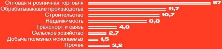 Доля отраслей в общем обороте малых предприятий России в 2016 году, %