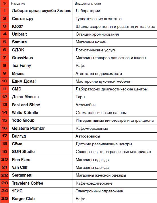В этом году Forbes публикует юбилейный, пятый рейтинг франшиз. По сравнению с первым, вышедшим в 2013 году, состав участников обновился почти на 90%, а лонг-лист франшиз вырос практически в два раза. Интерес к франчайзингу по-прежнему остается довольно высоким. По данным НАФИ (Национальной ассоциации финансовых исследований), 17% предпринимателей хотели бы открыть бизнес по франшизе. Как и в прошлом году, лидером стала «Лабораторная служба Хеликс». За прошедший год число точек в сети увеличилось на 25%. Новосибирская служба доставки СДЭК — лидер рейтинга по количеству точек — выросла почти на 40%. Для продавца франшизы рост франчайзинговой сети — это возможность масштабировать бизнес, не вкладывая собственные средства. А для покупателя — взять в аренду готовую бизнес-модель и получать помощь и советы от команды владельца франшизы. Слишком быстрый рост сети тоже палка о двух концах. «Полгода назад нам пришлось заморозить продажи франшизы, чтобы не потерять качество продукта, а сейчас мы снова готовы принимать новых партнеров», — говорит Барно Турсунова, совладелец франшизы автоцентров «Вилгуд». Компания — новичок рейтинга — за год выросла в 2,5 раза благодаря повторным продажам франшиз, количество точек сети увеличилось в четыре раза. Средняя годовая прибыль точки «Вилгуд» в 1,3 раза превышает затраты на ее открытие.