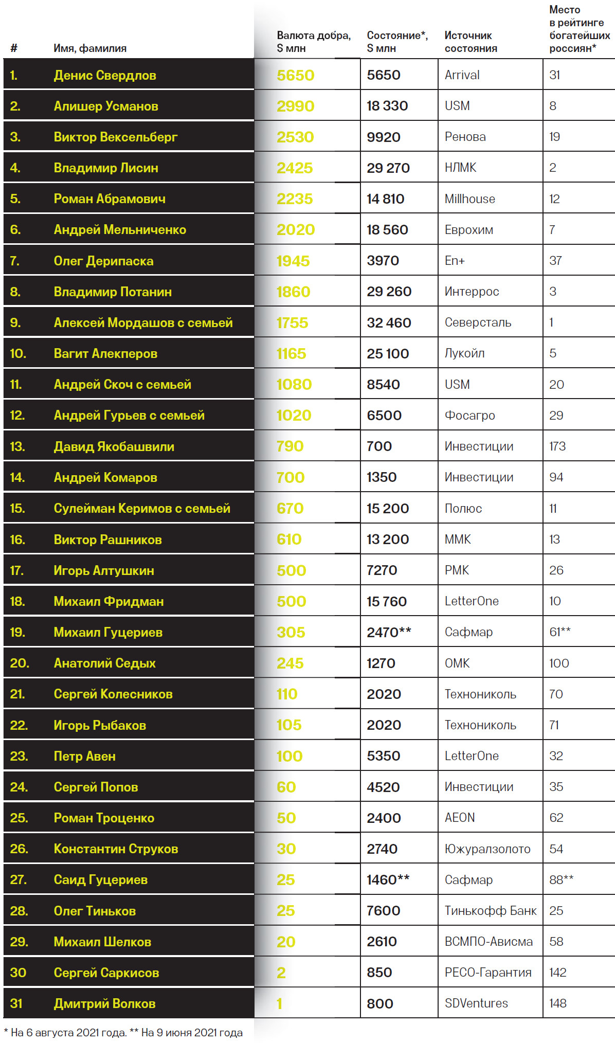 Особняком в рейтинге стоит его лидер — бывший замминистра связи Денис Свердлов. Если для подавляющего большинства участников рейтинга «валюта добра» рассчитывалась как расходы (инвестиции), то «валюта добра» Свердлова целиком складывается из стоимости его доли в производителе коммерческих электромобилей Arrival, так как весь проект направлен на улучшение экологии. Эту компанию Свердлов зарегистрировал в 2015 году, первые поставки электробусов британскому автобусному оператору First Bus запланированы на конец 2021 года, в перспективность технологии поверили сначала автомобильные гранды Hyundai и Kia, вошедшие в капитал Arrival, а затем сотни инвесторов, купивших акции в ходе размещения на бирже. Доля Свердлова в Arrival оценивалась на 6 августа в $5,65 млрд.