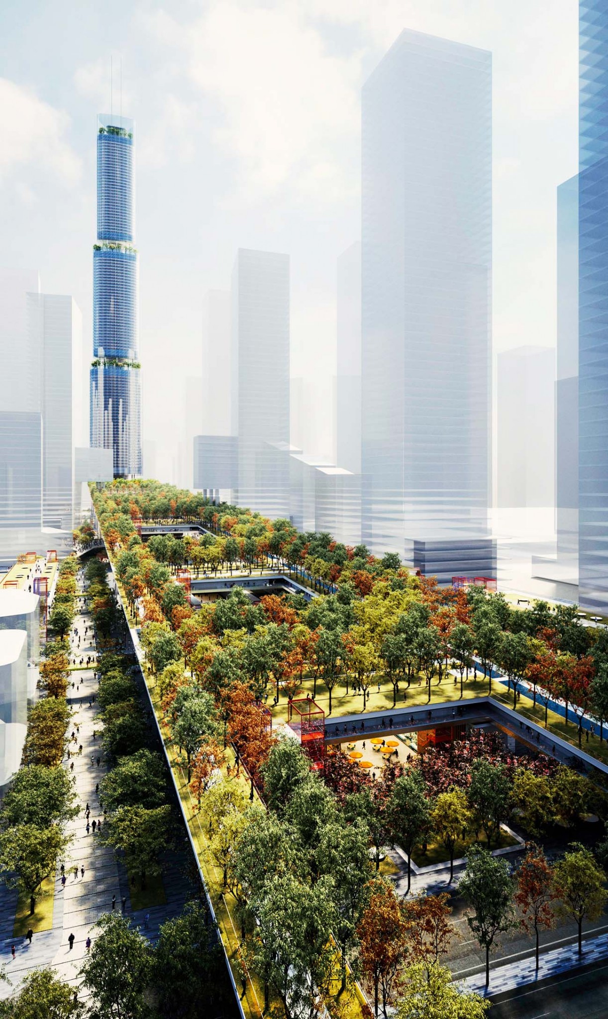 В минувшем октябре британское архитектурное бюро Rogers Stirk Harbour + Partners выиграло конкурс на проектирование огромного и сложного многофункционального инфраструктурного комплекса в пригороде Шэньчжэня Цяньхае, недалеко от границы с Гонконгом. На вершине этого сооружения будет разбит парк — висячий сад протянется в длину более чем на километр и соединит по прямой квартал небоскребов Цяньхая с гаванью. Похожие проекты уже есть. Парк High Line в Нью-Йорке, построенный на эстакаде вышедшей из употребления железнодорожной ветки, известен всему миру. Власти Сеула решили не разрушать высотную скоростную автостраду 1970-х годов и переделали ее в пешеходную зону с садом длиной в километр и высадили там 24 000 растений разных видов. Китайский парк тоже связан с транспортной инфраструктурой. Под землей (и под парком) будут курсировать скоростные поезда, на уровне земли — улично-дорожная сеть, а наверху