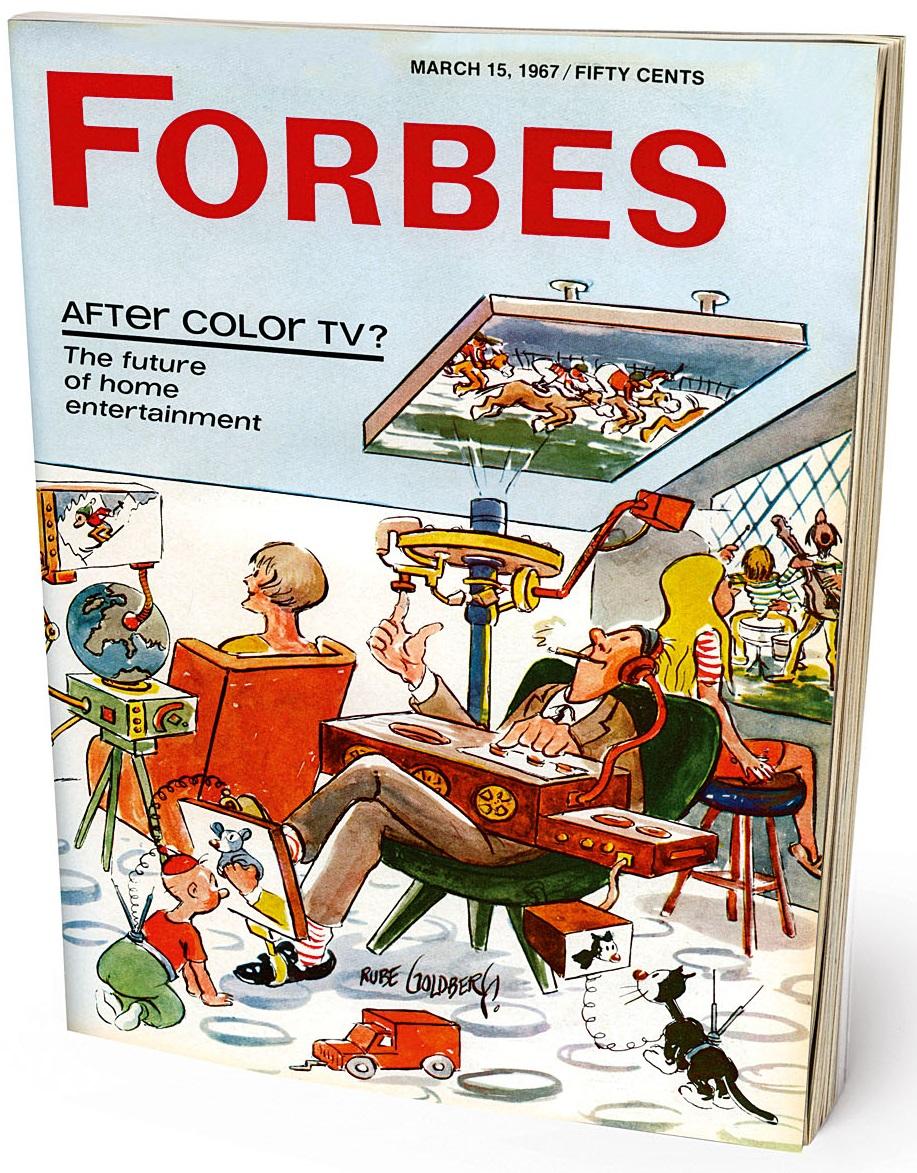 «Скоро люди перестанут друг с другом разговаривать. Они будут только смотреть телевизор», — предсказывал Руб Голдберг, 83-летний лауреат Пулитцеровской премии. Художник сделал обложку, иллюстрирующую рост индустрии развлечений для дома. За 5 лет расходы потребителей на телевизоры и стереосистемы удвоились, достигнув $5 млрд ($36 млрд в нынешних ценах), а Кеннет Шварц написал футуристический скетч, предсказав появление цветного видеомагнитофона, огромных экранов, кабельного и спутникового ТВ. Предвидел он и стриминг, и даже смарт-ТВ. Лишь одну серьезную ошибку допустил Шварц: он считал, что платное ТВ никогда