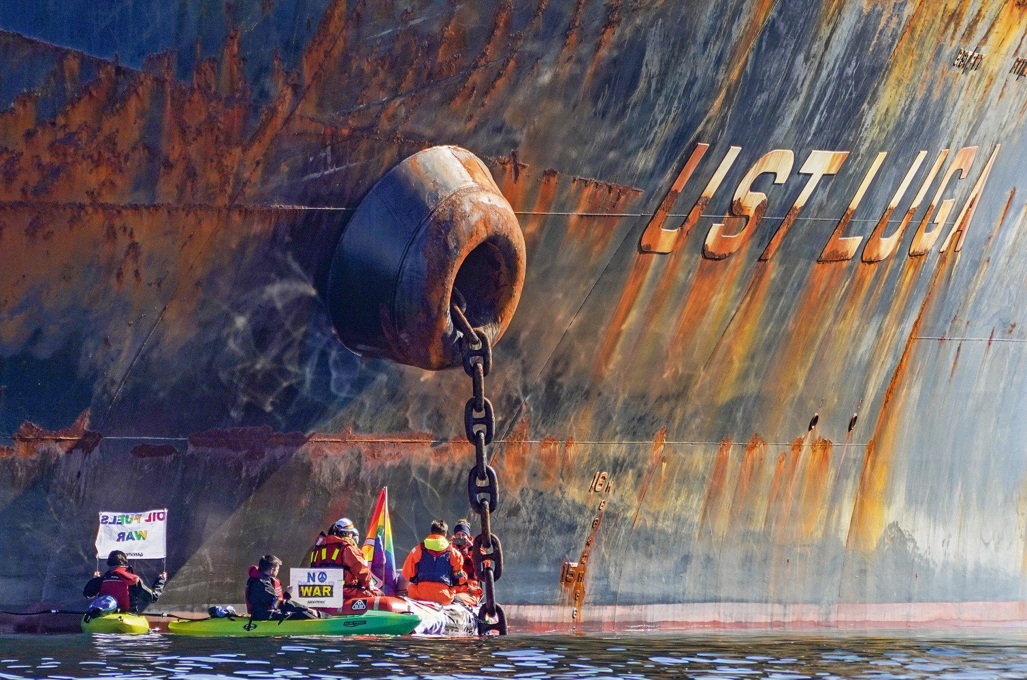 Двадцать пятого апреля нефтяной танкер «Усть-Луга» зашел в воды фьорда Осло и приготовился к швартовке. Судно c партией российского топлива для норвежской «дочки» ExxonMobil должно было разгрузиться в порту Слагентанген во второй половине дня. Вдруг со стороны берега показалась красная надувная лодка. Настигнув танкер, экипаж приковал свою шлюпку к его якорной цепи, и группа поддержки на двух зеленых каяках развернула транспаранты с пацифистскими лозунгами. «Усть-Луга» оказалась блокирована. «Нефть лежит в основе не только климатического кризиса, но также войн и конфликтов», — заявил организатор акции, глава норвежского отделения Greenpeace Фроде Плейм и потребовал от норвежских властей отказаться от импорта российской нефти.
