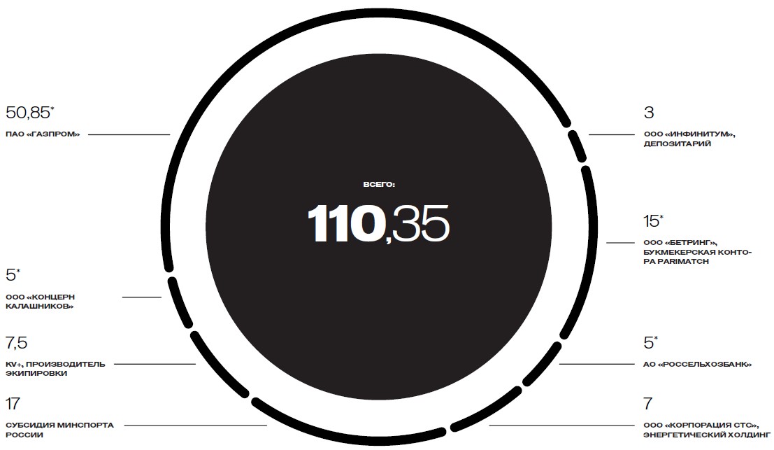 *Сумма без учета НДС, который СБР платит с дохода от спонсорских контрактов. Поступления от ООО «Инфинитум» и ООО «Корпорация СТС» оформлены как благотворительные и не облагаются налогом.