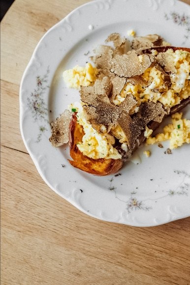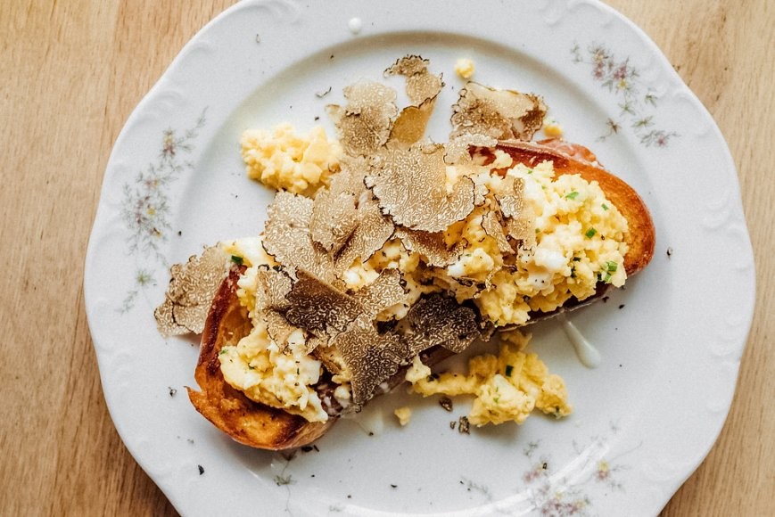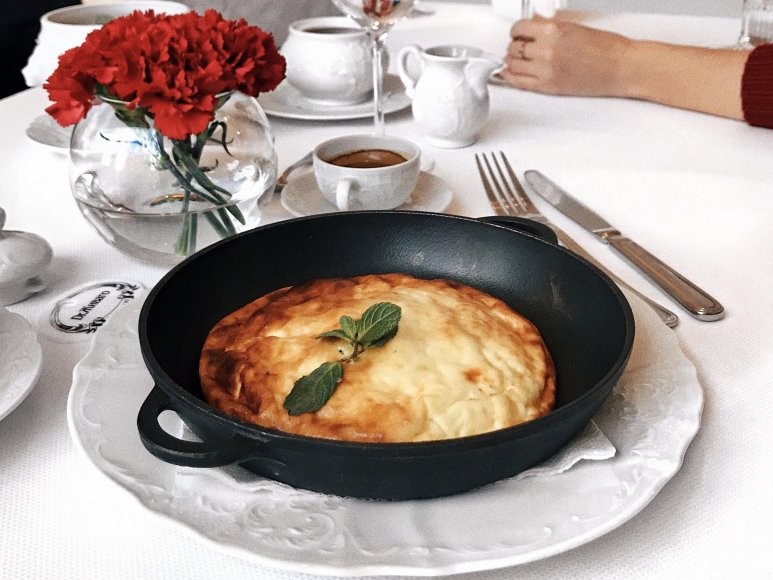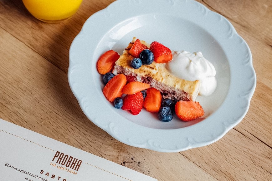 В итальянском ресторане Арама Мнацаканова на Цветном, помимо классической овсяной каши, тоста из свежеиспеченного хлеба с джемом и маслом или яичницы с разными добавками, готовят фирменный аджарский омлет борани (350 руб.) — по рецепту шеф-повара Гии Хучуа из грузинского ресторана Арама в Петербурге «Мама Tuta». К яйцам, по традиции, добавляют молоко и сыр сулугуни, хорошенько взбивают и запекают вместе со сливочным маслом. Но можно и шикануть и заказать скрамбл с черным трюфелем (990 руб.), который замешивается с пармезаном и луком сибулет, поливается фондю из ароматного сыра таледжо и подается на ломте сдобной халы, которую перед этим поджаривают на сливочном масле. Сам ресторатор неизменно (сами видели) на завтрак заказывает творожную запеканку «как в детстве» за 300 руб. и всегда просит с двойной порцией сметаны.