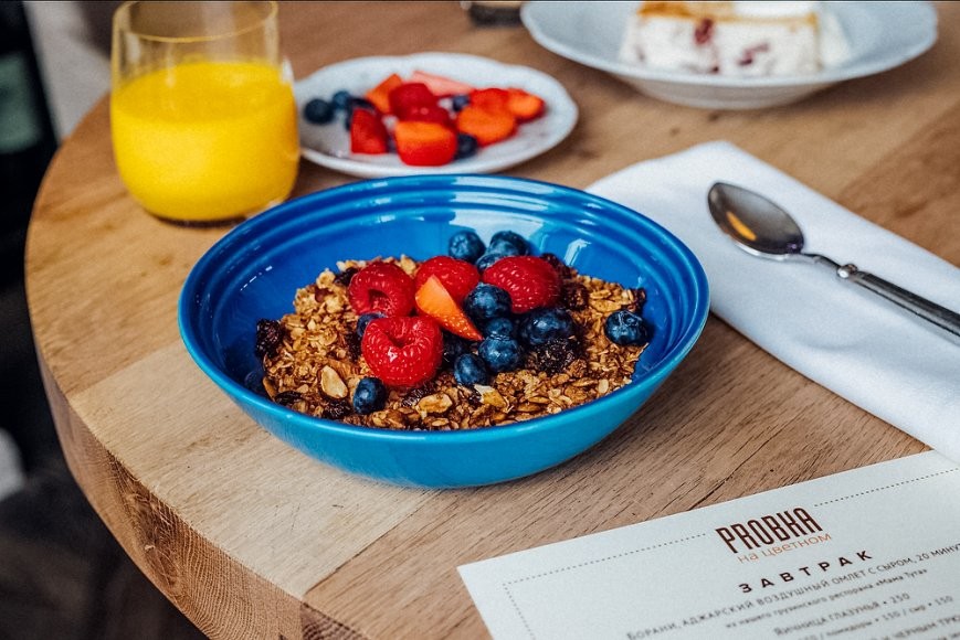 Шеф Владимир Чистяков рекомендует попробовать фирменный завтрак Buro — глазунью из двух яиц с картофельным гратеном и авокадо (470 руб.), а любителям плотных завтраков — рибай «dry age» с трюфелем, яйцом пашот и брокколи (1390 руб.). Хотите что-то полегче? Тогда закажите яйца «бенедикт» с лососем или крабом на бриоши или скрамбл с цветной капустой и трюфелем (390 руб.). Как вариант: овсяная или рисовая каша, авокадо-тосты, сырники со сметаной и смузи-боул на миндальном молоке с домашней гранолой.