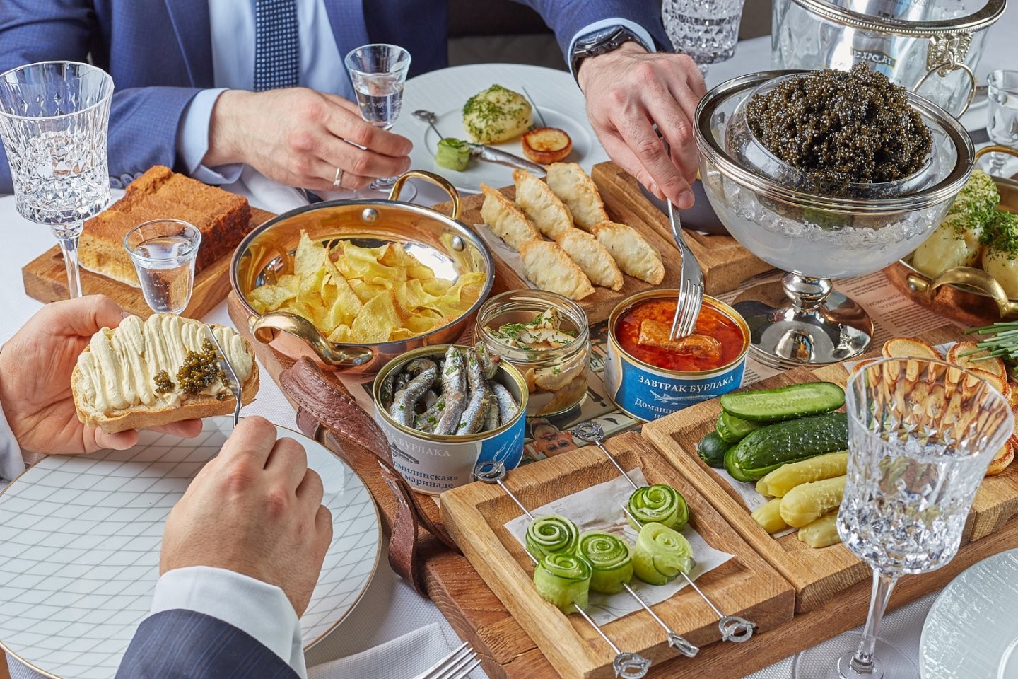 Спецпредложение утреннего меню — «Завтрак бурлака». Во главе стола — 1 кг черной икры, аккомпанементом к которому выступают вареные вкрутую перепелиные яйца и домашние консервы из осетрины, килька «Томилинская» в домашнем маринаде, малосольные огурцы, печеный картофель с укропом, расстегаи с визигой, малосольные белые огурцы, террин из огурцов, маринованные белые грибы, оладушки, картофельная лапша со сливочной страчателлой и, конечно, душистый «черный хлеб» — ржаная бриошь, вымоченная в специальном креме. Для большой компании удовольствие это вполне доступное — 40 тыс. руб., а радость от встречи с друзьями (особенно с иностранными) и яркие впечатления от съеденного и выпитого, как известно, бесценны.