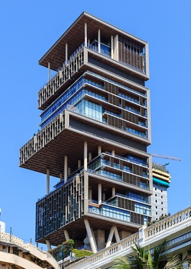 Над бомбейскими городскими джунглями возвышается 27-этажный гигант, построенный миллиардером Мукешем Амбани. Этот необычный дом носит название Antilia в честь острова-призрака в Атлантическом океане. И в самом деле, 173-метровый колосс, возведенный чикагским архитектурным бюро Perins&Wall, смотрится нереалистично на фоне типовой городской застройки.