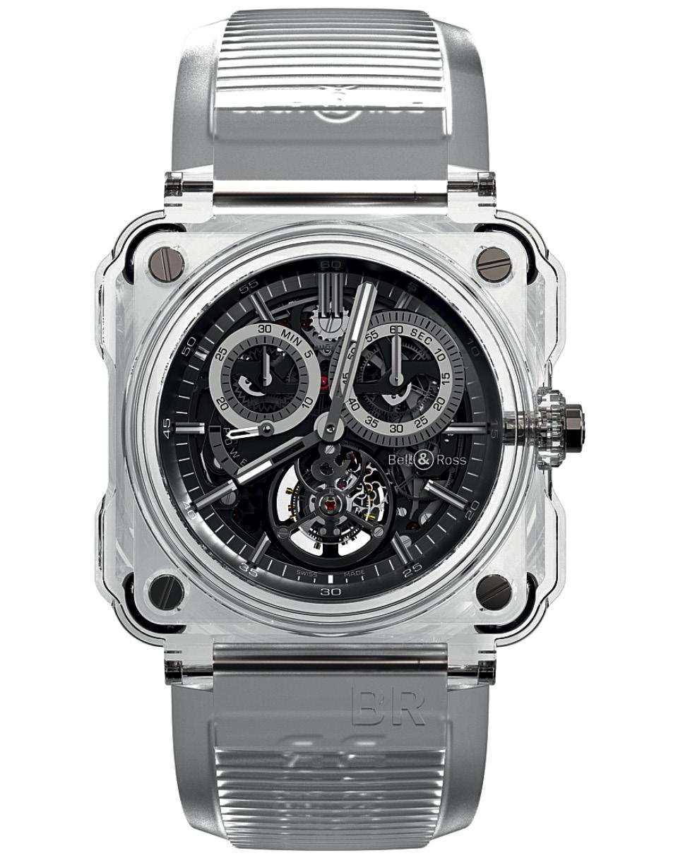 Свой самый сложный механизм BR‑CAL.285 часовщики положили в стеклянный корпус-витрину, чтобы похвастаться работой однокнопочного хронографа и «летящего» турбийона.