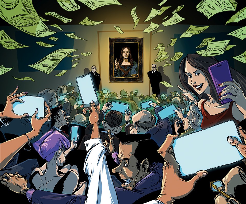 Вечером 15 ноября 2017 года торги прошли совсем не так, как здесь привыкли, — битва за картину Леонардо да Винчи «Спаситель мира» длилась бесконечные 20 минут и обернулась самой дорогой в истории продажей предмета искусства: полотно 66 на 45 сантиметров ушло за 27 миллиардов рублей. В зал набилось более тысячи человек, за аукционом следили коллекционеры со всего мира — и все понимали, что стали свидетелями исторического момента. Взгляды были обращены к картине, история которой до, во время и после торгов напоминает боевик Гая Ричи.