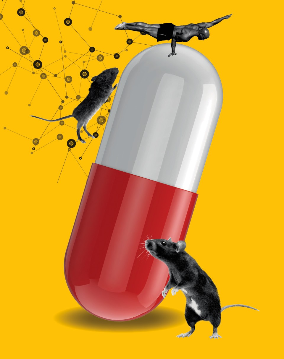 Мыши любят бегать, рассказывает он: если поставить в клетку беговое колесо, грызуны с удовольствием, безо всякого принуждения намотают несколько километров за вечер. Но некоторым, как показывает пример Лэнса Армстронга — человека, бега и упражнений мало. Когда Эванс начал давать препарат мышам, уже освоившим беговое колесо, он обнаружил, что через месяц выносливость зверьков увеличилась на 75 процентов. Талия и процент жира уменьшились, а в мышечном строении начали преобладать быстрые мышечные волокна — те, которые медленнее устают, сжигают жир и сильно помогают марафонцам. Говоря по-человечески, это как если бы начинающий джоггер однажды утром проснулся и увидел в зеркале, что теперь он — кенийский бегун.