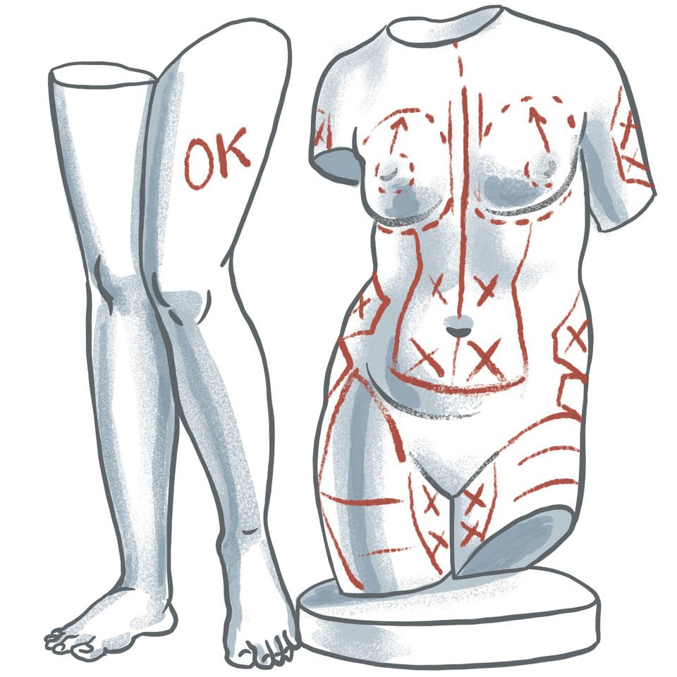 Вечный источник страданий и восхищений, внимания и отчаяния — вот что такое женское тело. Если ты стала его счастливой обладательницей, то получать комментарии на тему того, как оно выглядит, будешь всю свою жизнь, хочется тебе этого или нет. Родственники, подруги, коллеги, любовники и любовницы — им всем найдется что сказать. К сожалению, это не всегда комплименты. Хотя иногда везет. Один таксист, например, несколько лет назад кричал мне вслед: «Вот это ноги! Это что за ноги! Их надо срочно в музей — такие ноги!» Несмотря на то что я живо представила, как меня расчленяют и нижние конечности увозят в ГМИИ им. Пушкина, мне все равно было очень приятно, и я этого таксиста с теплотой вспоминаю, пусть ему всегда по тройному счетчику платят. А вот папа в детстве говорил, что ноги мне, к сожалению, достались по еврейской линии, кривенькие, в форме буквы «икс». Сколько людей — столько и мнений, конечно, но не все нужно высказывать вслух, особенно маленьким девочкам, для которых твои слова очень важны и во многом определяют дальнейшую жизнь.