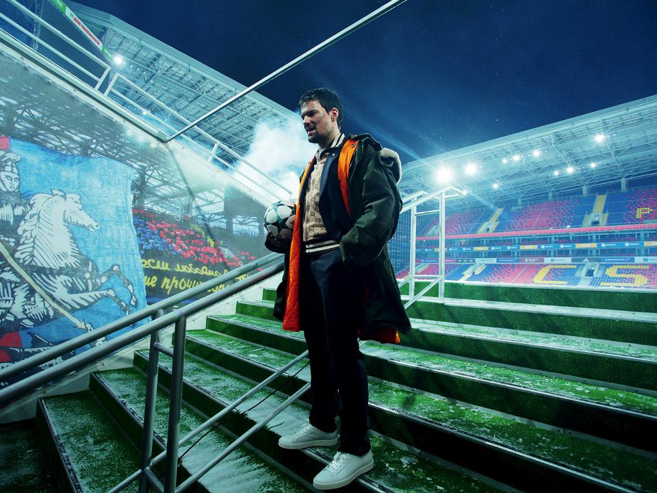 На съемке обложки апрельского номера на стадионе ЦСКА все были заняты делом. Актеру Даниле Козловскому размазывали по лицу свежую грязь, фотограф Данил Головкин разбирал оборудование в подтрибунной зоне, главный редактор GQ Игорь Гаранин (в пальто от Gucci)