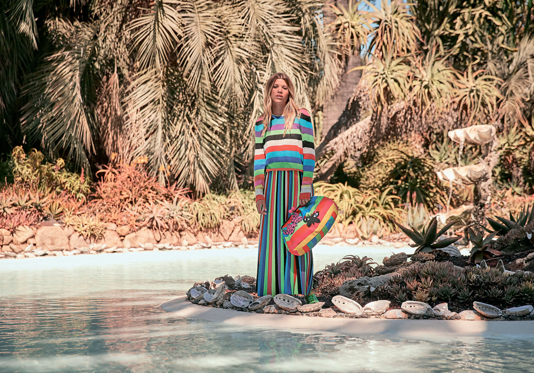 Ей 22 года, она мила и жизнерадостна, с ранних лет любит моду и искусство. Вот почему София Ричи так органично воплощает дух красочной капсулы Weekend Max Mara Flutterflies, созданной совместно с Дональдом Робертсоном, американским иллюстратором и художником. Коллекция выделяется мультяшными принтами и веселыми, энергичными расцветками. Когда я встречаюсь с Софией после съемки в Санта-Барбаре, Калифорнии, она приветствует меня широкой и теплой улыбкой, которая, впрочем, скрывается под маской, пока мы не устраиваемся с надлежащей дистанцией. «Мне очень жаль, что мы встречаемся в таких странных обстоятельствах, – говорит она. – Даже не могу вам руку пожать, прошу прощения». Месяцы пандемии, по словам Софии, она проводит с семьей.