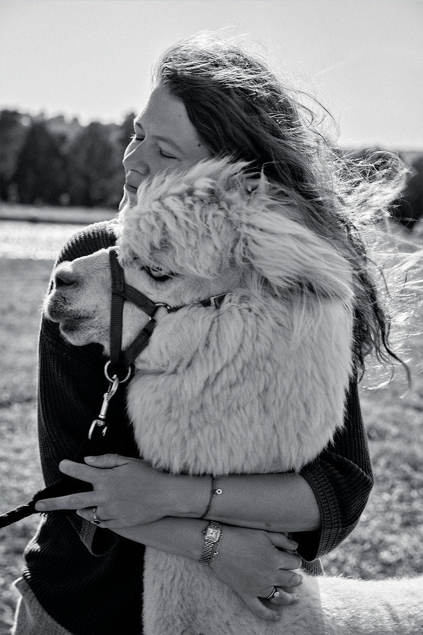 Шел 44-й день августа. Раннее утро. Светит солнце. Я допиваю кофе и выезжаю с Катей Лазаренко за город на съемку. Целый день провожу с командой в обществе альпак, шотландских коров, лебедей, кроликов и моего ассистента Полли. Этот день мы могли провести в студии. Но в какой-то момент я поняла, что просто не могу упустить шанс снять эту историю с Даней Головкиным на природе в такую погоду. И ни разу не пожалела! Наблюдать за всеми участниками процесса было сплошным удовольствием: взрослые люди, профессионалы своего дела, вдруг на какое-то время будто вернулись в детство. Мы кормили милейших альпак, с трясущимися коленками заходили к могучим коровам и быкам (оказалось, эти очень крупные животные могут захотеть