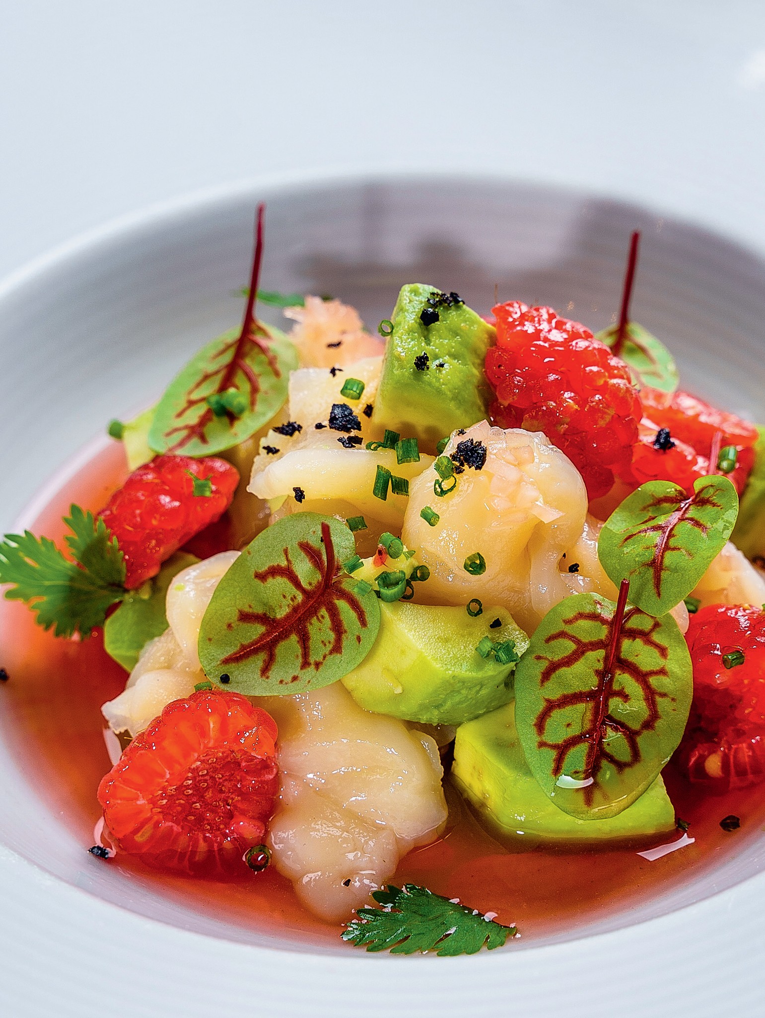 «По названию заведения нетрудно догадаться, что акцент в нем сделан именно на гребешке: ему даже отвели отдельный раздел в меню, на секундочку. Поэтому неудивительно, что у меня на столе оказались две закуски – разные, но обе из основополагающего ингредиента. Первая была горячая и подавалась в ракушках: это запеченные гребешки с прованскими травами – то самое блюдо, ради которого точно стоит сюда идти. Оно очень красивое внешне и вдобавок невероятно вкусное: моллюски запекаются в сливочном масле с травами и подаются, посыпанные хлебной крошкой. Вторая закуска – холодная, с понзу. В ней яркое послевкусие дает свежая малина и соус из нее же: это удивительно нежное сочетание с гребешком и авокадо, о котором я могу говорить много, но не буду – лучше скорее бегите пробовать. Следом, на горячее, был осьминог. Пока я его ела, было чувство, что путешествую по Сардинии: его щупальца тут готовятся по традиционному островному рецепту –