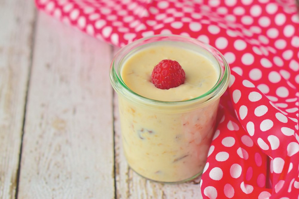 1. Творог взбить с маслом, добавить сок, размятый вилкой банан и цельнозерновые хлопья.