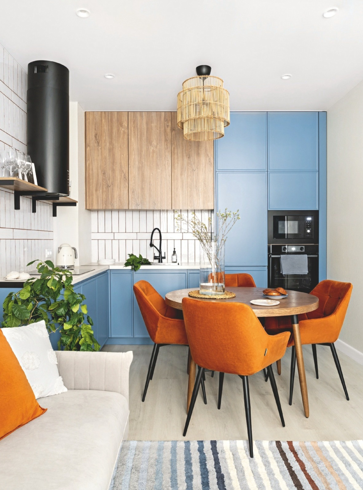 Базовым цветом в квартире сделали спокойный светло-серый оттенок, акцентные же цвета дозированно повторяются в разных элементах декора и мебели. В зоне кухонного фартука уложили плитку. Матовый ПВХ-потолок в кухне-гостиной опустили на 10 см. Это сделано для того, чтобы предусмотреть выводы для люстр и точечных светильников, а также провести дополнительные силовые провода для кухонной техники (количество изначально запланированных застройщиком розеток было недостаточным для современного комфортного использования. В зоне вытяжки от кухонной столешницы до потолка смонтировали плитку с необычной раскладкой. Швы сделали