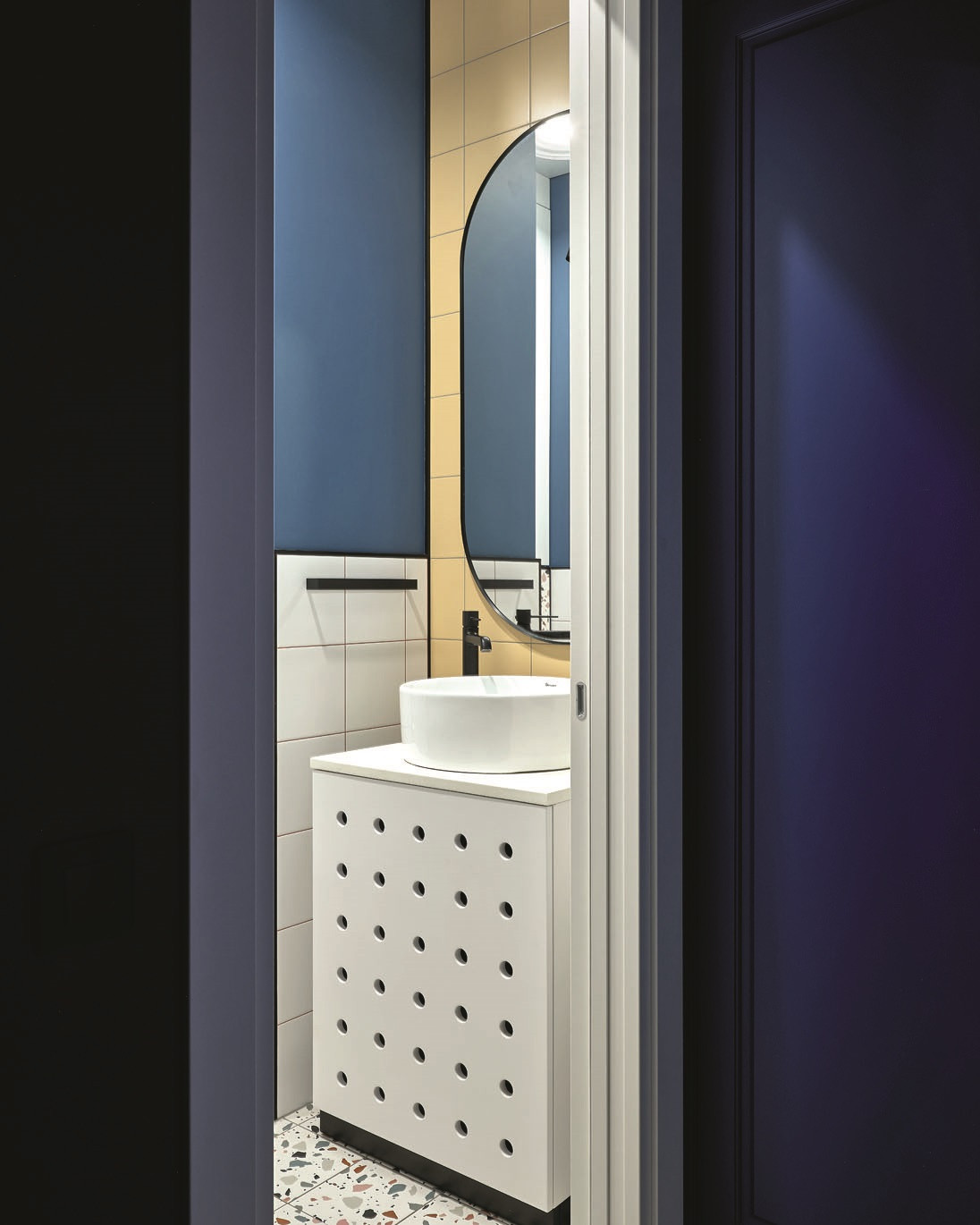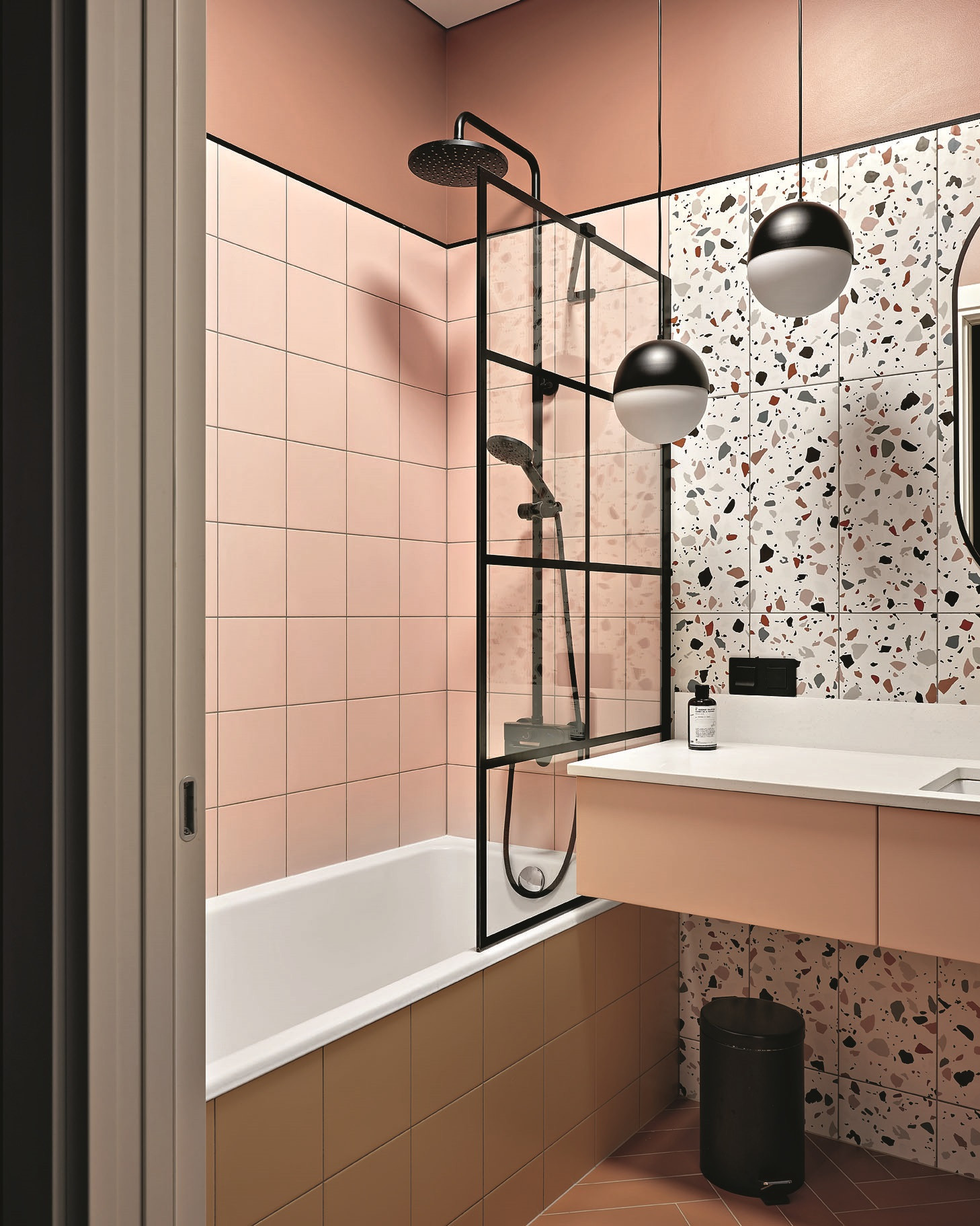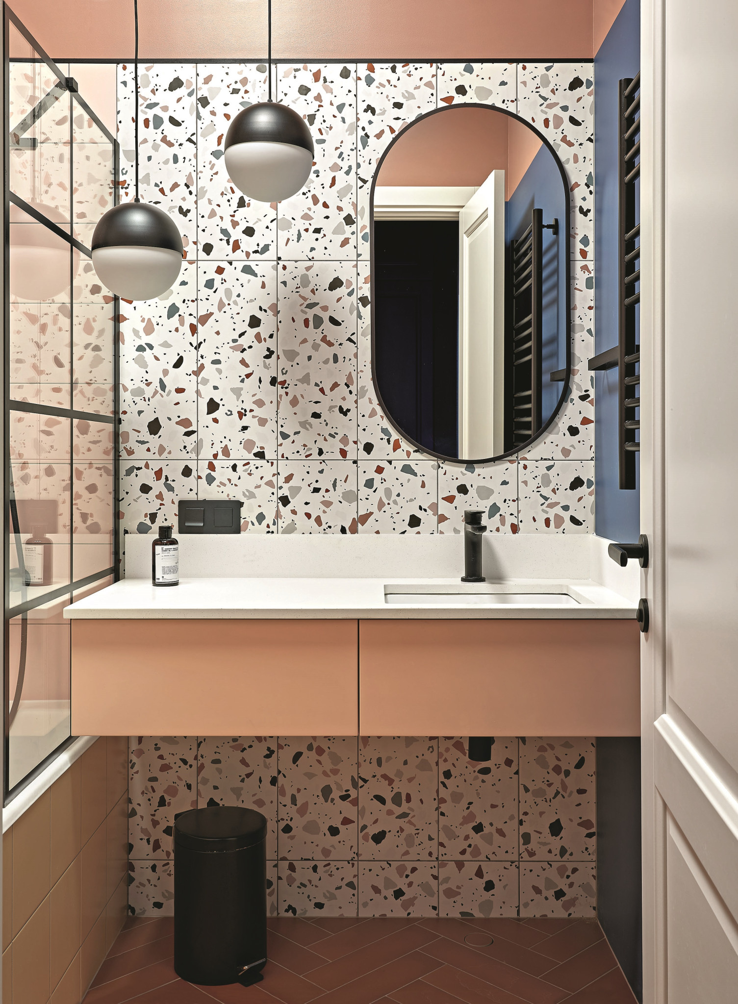 «Запрос от клиентов был — сделать два санузла, — рассказывает дизайнер. — Они располагаются рядом и оформлены в похожем стиле с заметным влиянием mid-century. Оттенки словно припылённые, приглушённые: мягкий жёлтый, серо-голубой, неяркий розовый. В качестве акцентных цветов использованы чёрный и белый. Овальное зеркало и круглые светильники в главном санузле — тоже элементы стиля. И конечно, керамогранит под терраццо. Изначально терраццо — это цемент с кусочками мрамора, но сейчас делают керамогранит, идеально имитирующий этот материал. А с точки зрения удобства он даже лучше». Автор проекта любит использовать плитку с орнаментами, особенно геометрическими, и всегда в курсе новых коллекций. Разрабатывая дизайн санузлов, она выбрала подвесные тумбы под раковину и подвесной унитаз — с ними пространство выглядит легче (плюс такие конструкции облегчают уборку). Модная тенденция — плиткой выложены не все стены целиком, в верхней части они окрашены, и яркая краска на контрасте с плиткой выглядит как нарядный фриз.
