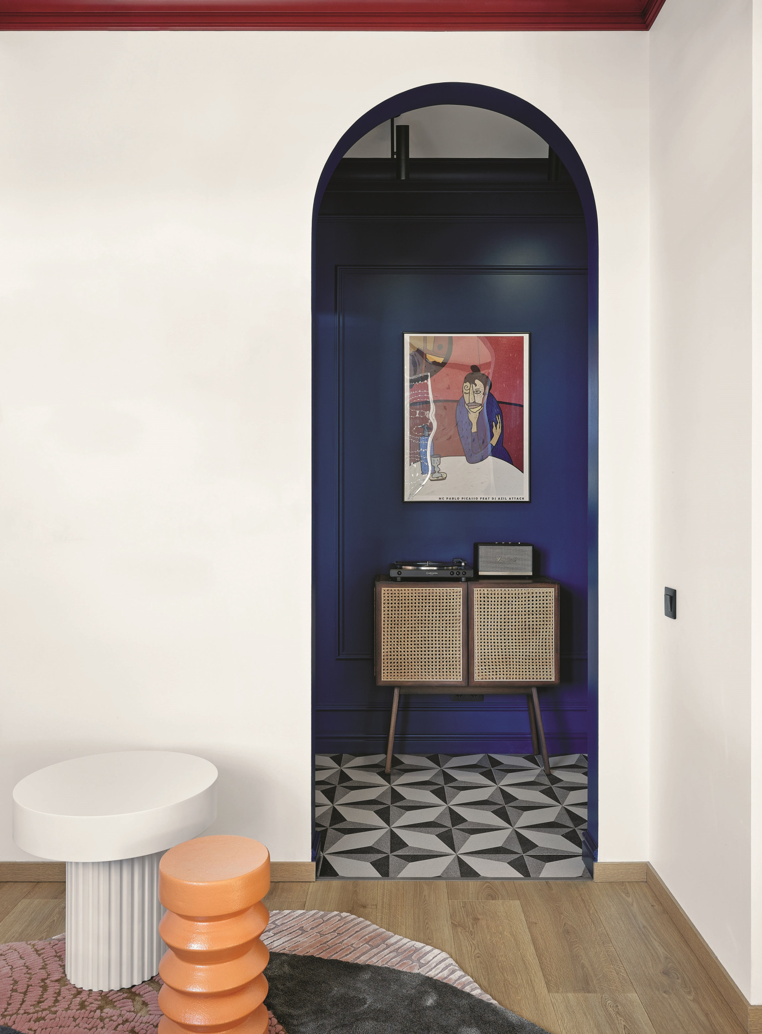 Дизайн. Чтобы отвлечь внимание от массивных бетонных балок, на потолке во всех комнатах сделали яркие карнизы. Сами балки белые, как потолок, и сливаются с ним. Также дизайнеру хотелось передать ощущение простора, и тут помогли и высокие потолки, окрашенные в белый цвет, и большие окна, и контрастные цветовые решения. Так, синий с белым создаёт впечатление свежести, а цветовое разнообразие переключает внимание, и квартира ощущается большой и полной воздуха.