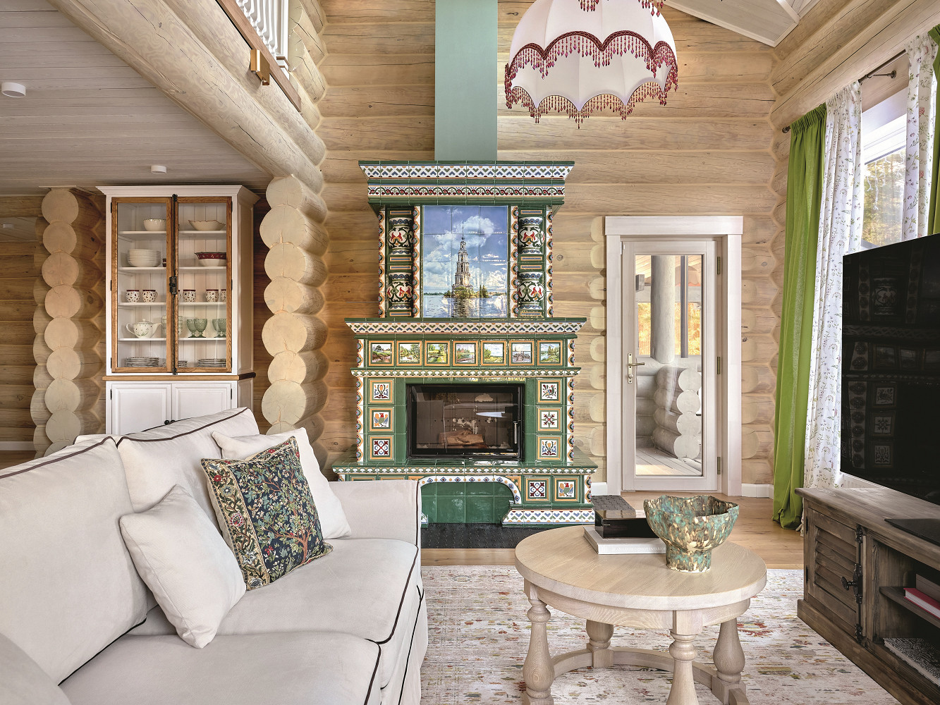 От предыдущего интерьера осталась основа камина в хорошем состоянии, а вот топку и отделку заменили. Идея вписать в дизайн камина — композиционного центра гостиной — окрестные пейзажи, принадлежит заказчику. Он сделал фотографию затопленной колокольни (символа Калязина), которая и стала прообразом центрального панно.