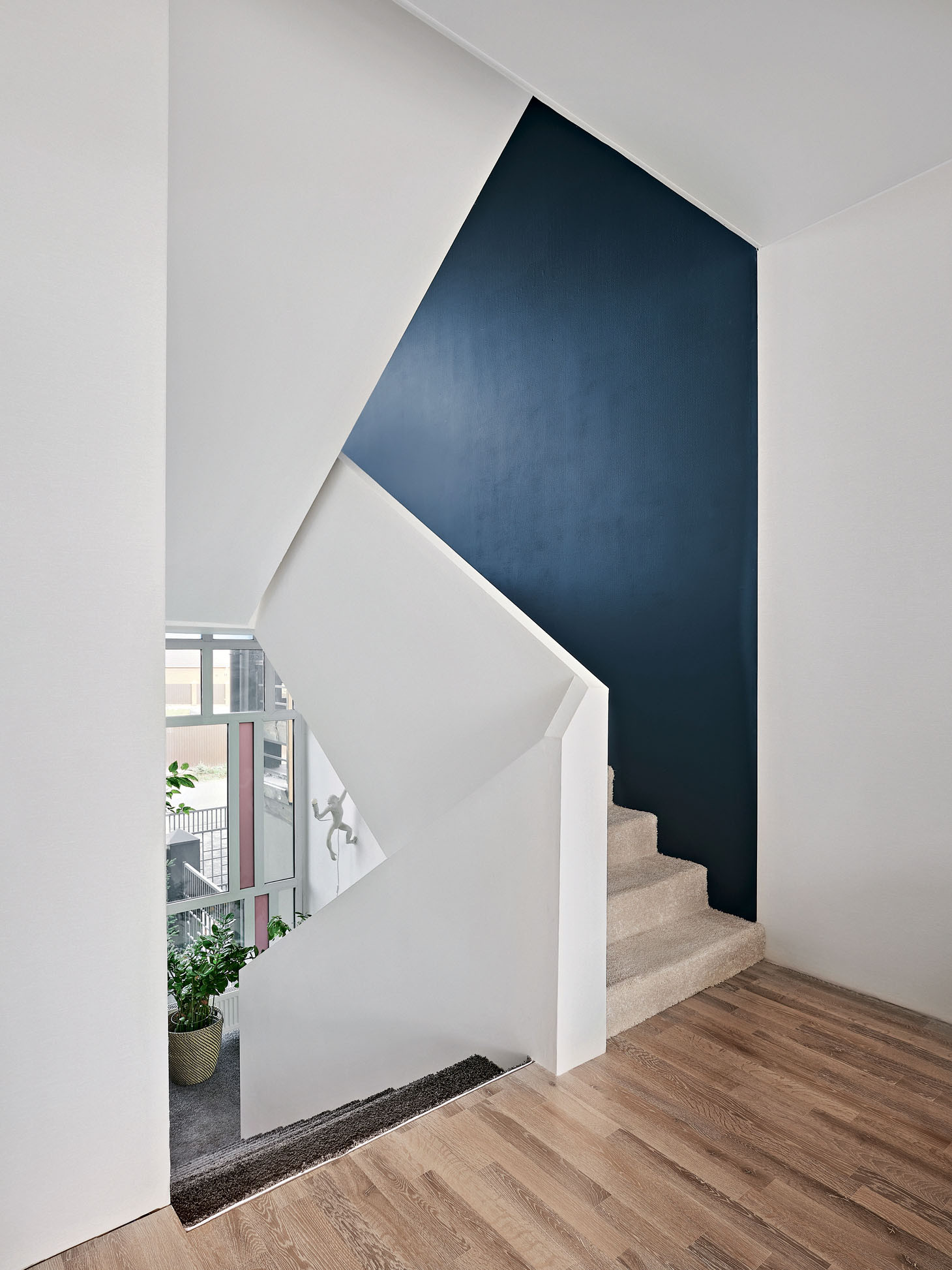 Ограждение лестницы выполнено необычным способом — из гипсокартона на металлическом каркасе. Эксперимент можно считать удачным. Расчётной прочности конструкции достаточно для функции перил, а, в отличие от традиционных балясин, сплошное ограждение не провоцирует детей просунуть ногу или голову между стойками. Ухаживать за материалом несложно благодаря покрытию моющейся краской. Дизайн воспринимается деликатно и легко. Напоминает оригами в увеличенном размере — фигурки из бумаги, искусство создавать которые пришло из Японии и полюбилось многим взрослым и детям.