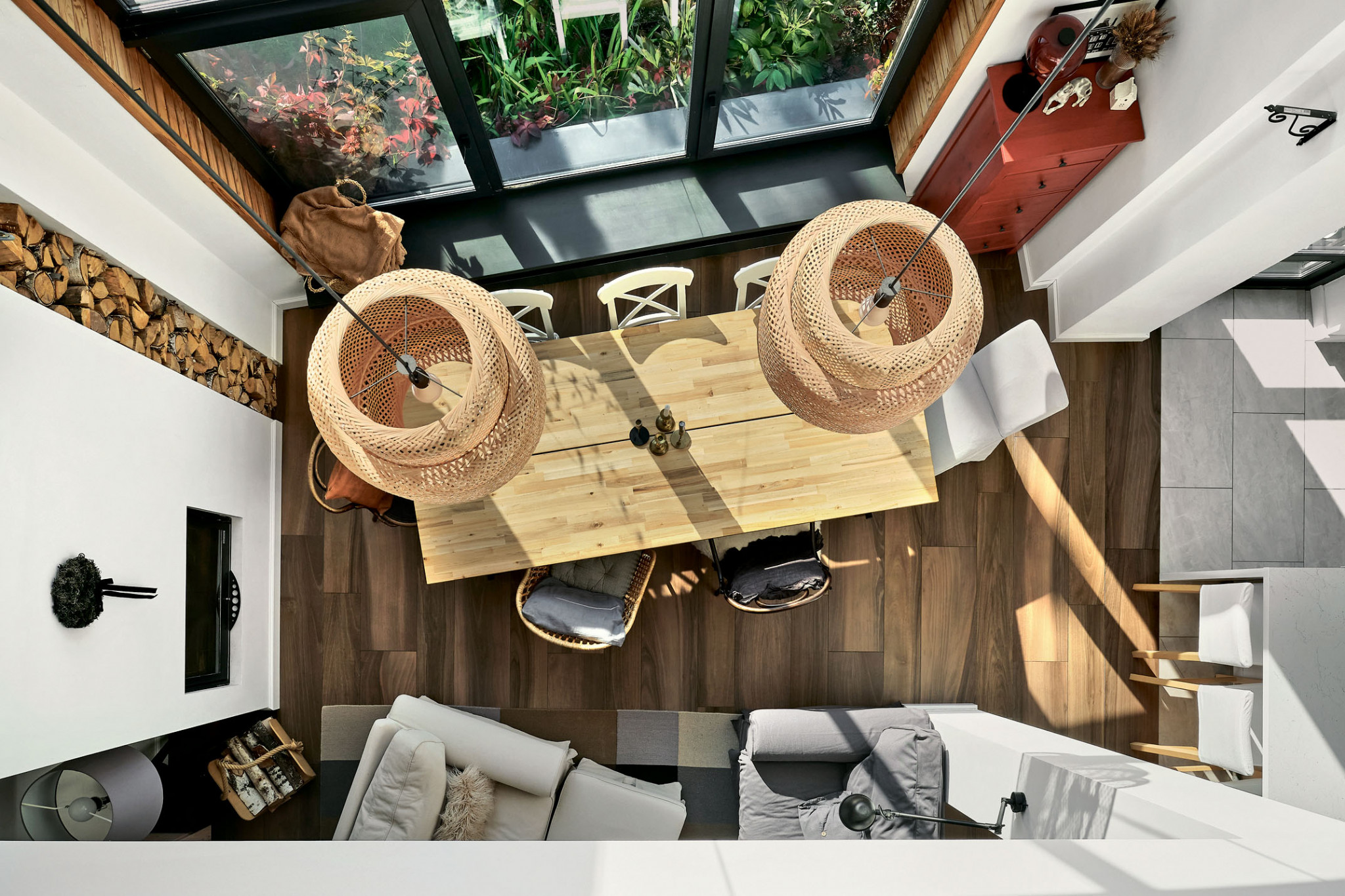 Панорамные окна и второй свет продиктовали планировочное и стилистическое решение общей жилой зоны — студийное пространство с элементами скандинавского стиля