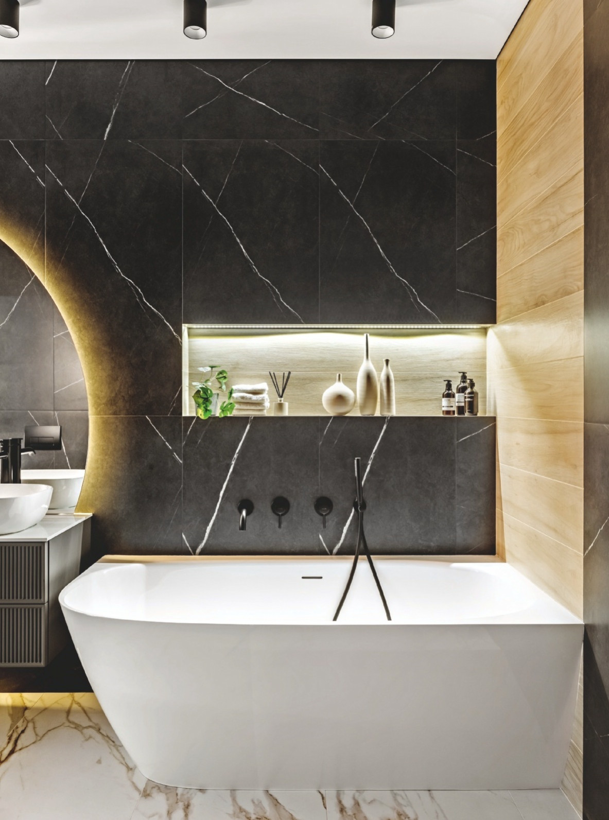 Пространство ванной комнаты представляло собой вытянутое помещение со смещённым к краю входом. Такая конфигурация усложняла возможность эргономичной планировки, но в итоге дизайнеру удалось разместить всё необходимое для создания современной и комфортной ванной комнаты. Санузел получился одновременно эстетичным и функциональным. За фасадами изготовленных на заказ шкафов помимо систем хранения скрыты все технические узлы: система очистки и умягчения воды, коллекторы и система
