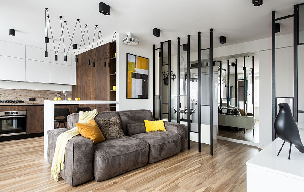 Дизайн. Современный урбанистический облик интерьера соединил приметы минимализма и функционализма, но с узнаваемыми, присущими лишь этому проекту чертами. Окна стали главными точками притяжения взгляда, и их не стали скрывать за шторами. Рискованное объединение четырёх зон (гостиной, столовой, кухни и прихожей), обычно упрощающее облик интерьера, в данном проекте элегантно уравновешено различными способами зонирования: разделяющим звеном между гостиной и кухней служат барный стол и спинка дивана, гостиную от прихожей частично отделили перегородки — две вертикальные металлические решётки с прикреплённым к ним стеклом. Лёгкий ритм их вертикалей как бы собирает невесомое пространство, пронизанное светом, и перекликается с такими графичными деталями, как необычная люстра с множеством плафонов на тонких диагоналях тросов, вытянутый трубчатый радиатор. Сдержанная цветовая гамма объединила решения всех зон и комнат.