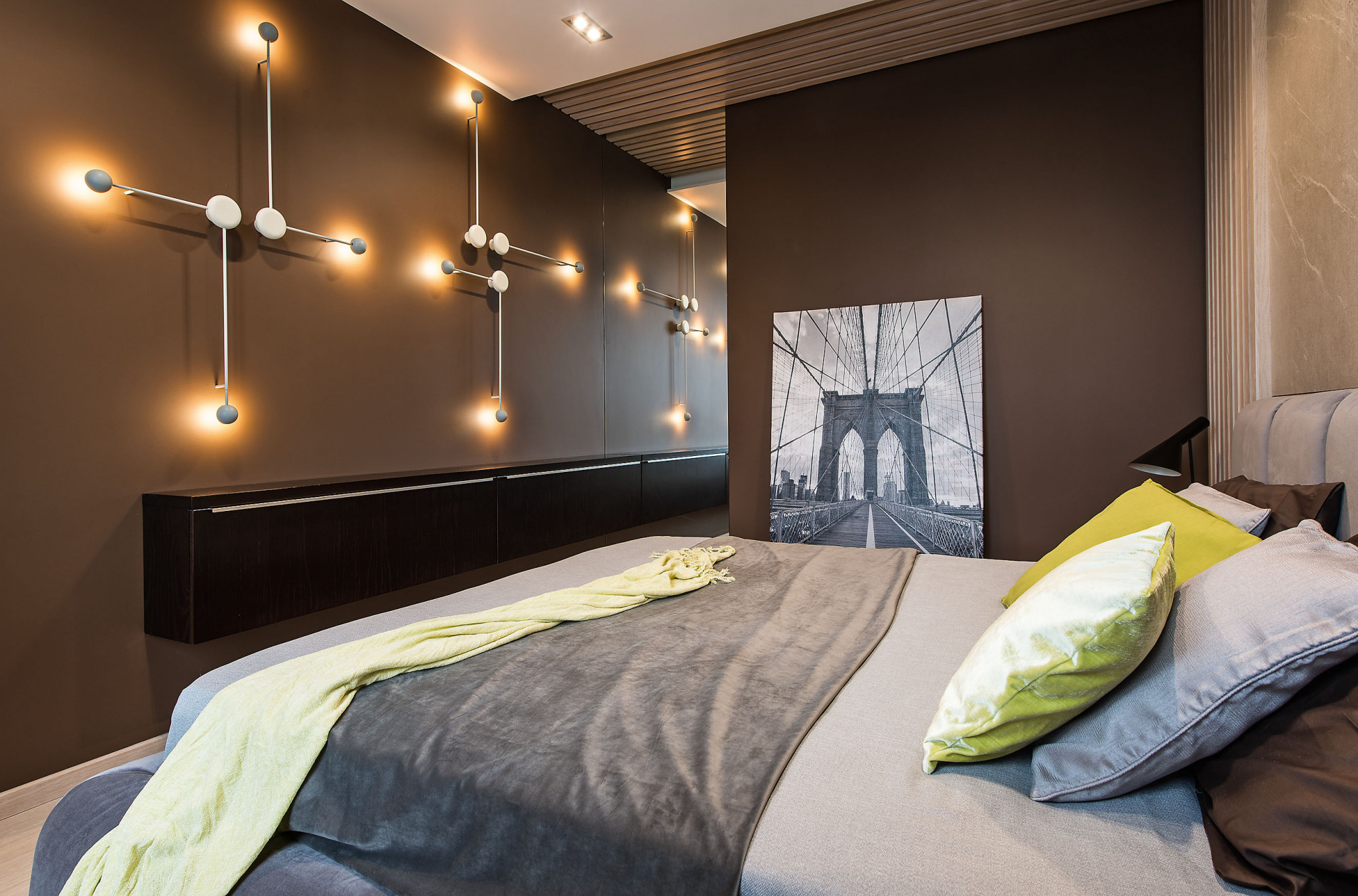 Маленькая спальня смотрится просторно и необычно за счёт оформления. Так, её стены окрасили в глубокий шоколадный тон — и интерьер приобрёл ощущение мягкой и тёплой глубины. Стену за изголовьем кровати оформили крупноформатной керамогранитной плиткой, напоминающей декоративное панно. Реечный декор из бруса, смонтированный по обе стороны от изголовья и переходящий на потолок, создал строгий ритмический рисунок, смещая пропорции и как бы растягивая границы помещения. Эта деталь перекликается с оформлением студии, где главную интригу создают две перегородки-кулисы — вертикальный ритм металлических прутьев чёрного цвета, закреплённых на полу и потолке, задаёт своего рода систему координат.