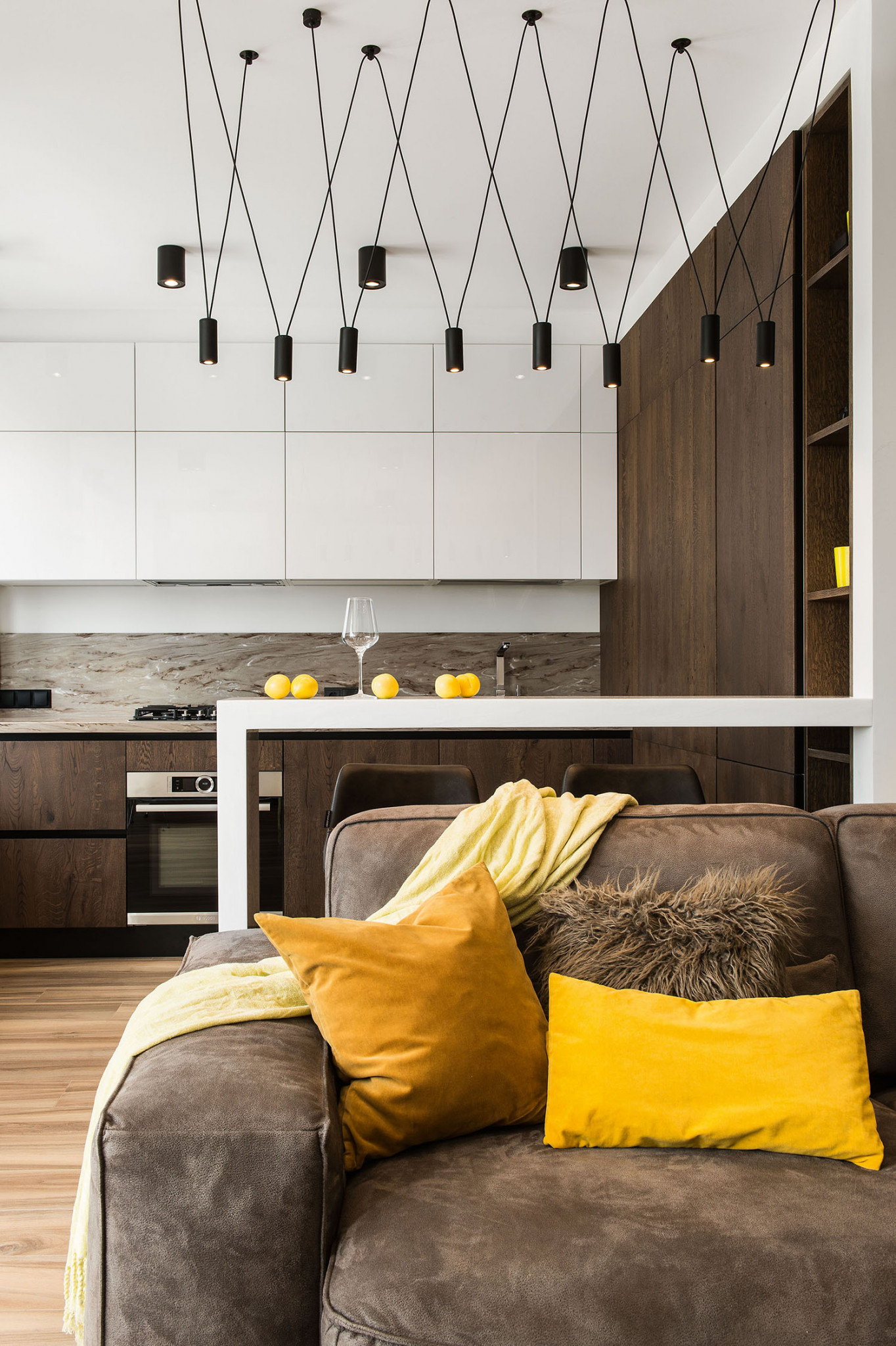 Графичность, которую придают интерьеру перегородка из реек и светильник на подвесахстержнях, смягчают диван в велюровой обивке и паркетная доска с живой текстурой.