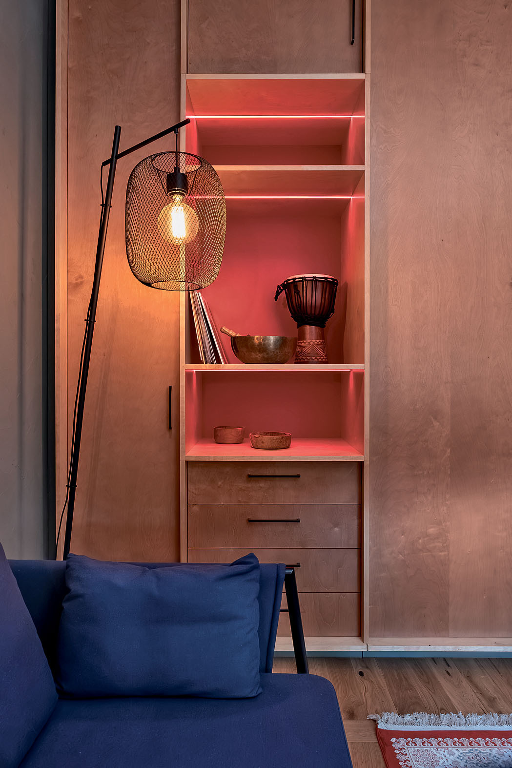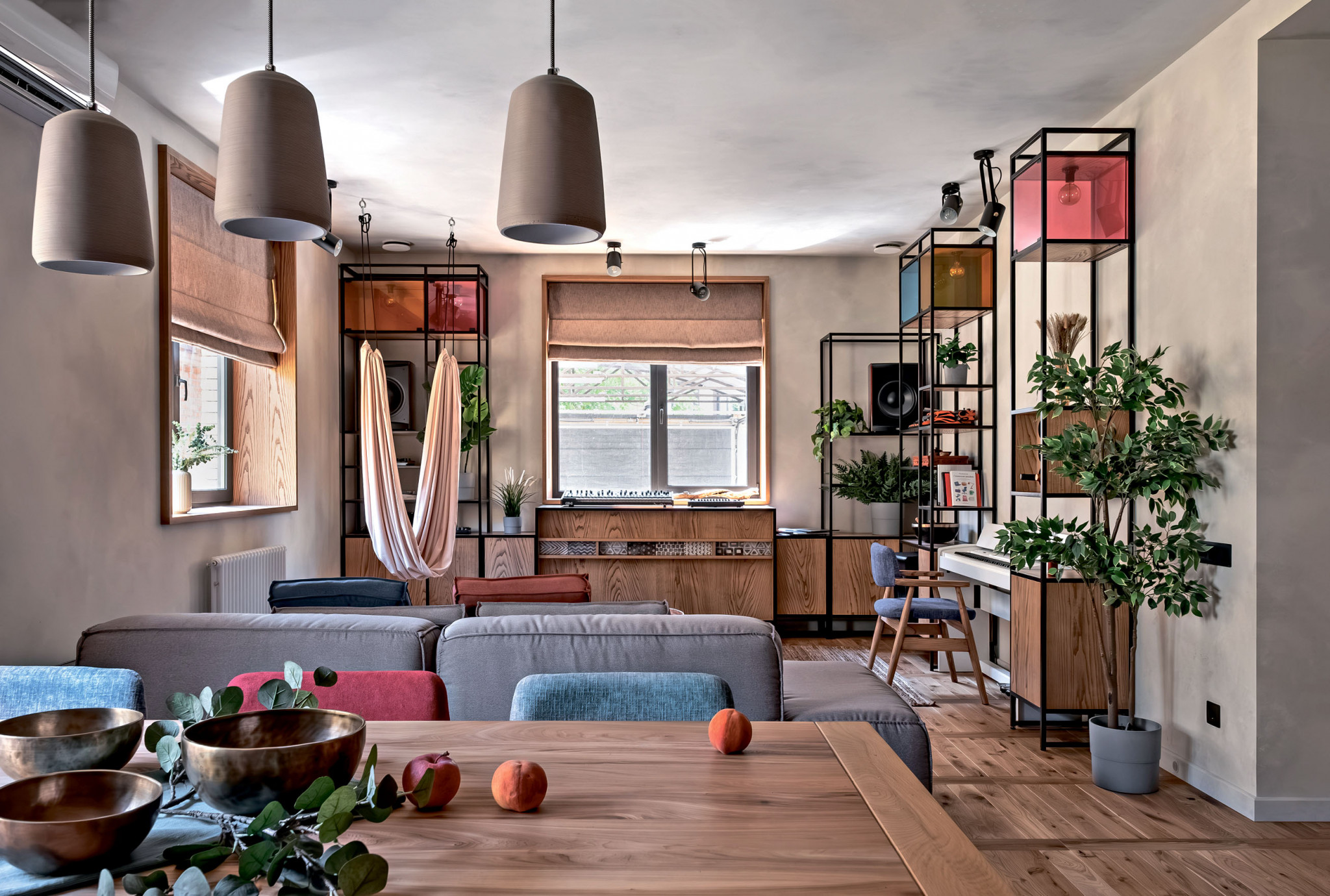 Хозяин дома увлекается музыкой. Для улучшения акустики в интерьер требовалось вписать звукопоглощающие поверхности. В результате дизайнер встроил в интерьер акустический диффузор. Ячеистую конструкцию из берёзовой фанеры разместили над кухонной зоной, на противоположной от источников звука стороне. Благодаря яркой авторской идее необычный функционально-декоративный элемент вписался на отлично. Цветом, дизайном и материалом исполнения он сочетается с другими предметами обстановки.