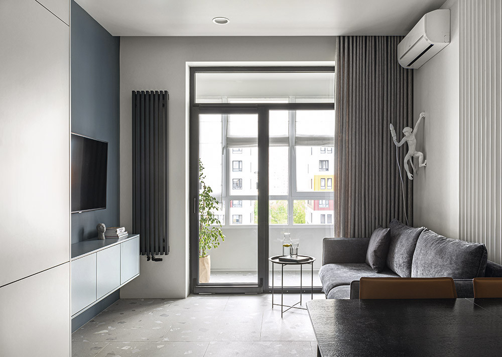 Ремонт. Изначально перегородок практически не было. Их возводили с нуля из пазогребневых плит. В квартире много железобетонных стен, которые нельзя штробить. Для прокладки коммуникаций приходилось наращивать стены из блоков, но архитекторам удалось спроектировать их так, чтобы максимально сохранить полезную площадь и функционал. Например, в прихожей блоками выделили место для встроенного шкафа. Залили стяжку. Пол в прихожей, санузлах, кухне-гостиной облицевали плитами керамогранита, в жилых помещениях и гардеробных застелили инженерной доской. Потолки выровняли листами гипсокартона, стены — штукатуркой и шпаклёвкой. В объединённой кухне-гостиной оконный блок с подоконником заменили раздвижным окном в пол и установили настенные радиаторы. Примыкающую к комнате застеклённую лоджию оставили холодной.