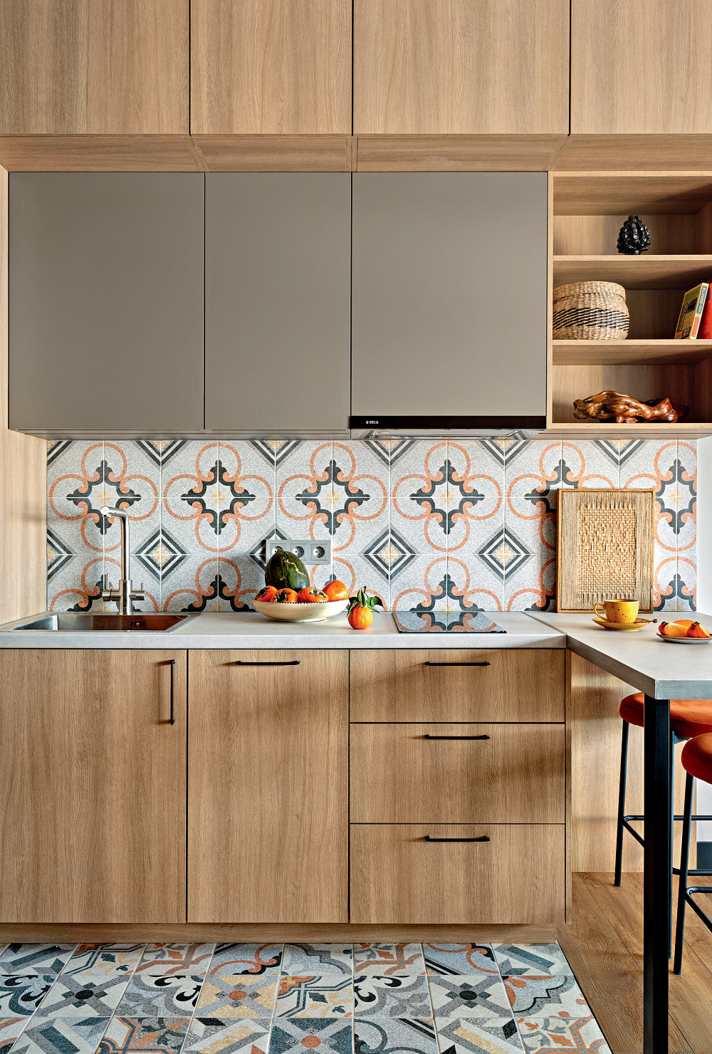 Ремонт. Стяжки от застройщика не было, поэтому её заливали в процессе ремонта. В жилой зоне на пол положили, помимо яркой плитки со средиземноморскими мотивами, клеевой кварцвинил с текстурой дерева, который добавил уюта. Санузел отделали плиткой и частично окрасили. Перегородки сделали из пеноблоков, подготовили под покраску, так как изначально было решено, что стены в жилой зоне будут окрашены. Фоновым цветом выбрали нейтральный серый (отсылка к теме «бетонных джунглей»), а акцентным — насыщенный, сложный оттенок зелёного. Им выкрасили стены гардеробной и санузла, врезающиеся в жилую зону, следуя принципу: что не можешь спрятать — выделяй, тогда недостаток будет восприниматься как фишка интерьера. Так и получилось. Потолок было решено делать натяжным — для быстроты и простоты монтажа. Потолок опустили на минимальное расстояние, которое позволили коммуникации; больше всего он опустился в санузле и гардеробной из-за подключения вентиляции и в коридоре — по уровню входящих в квартиру коммуникаций.