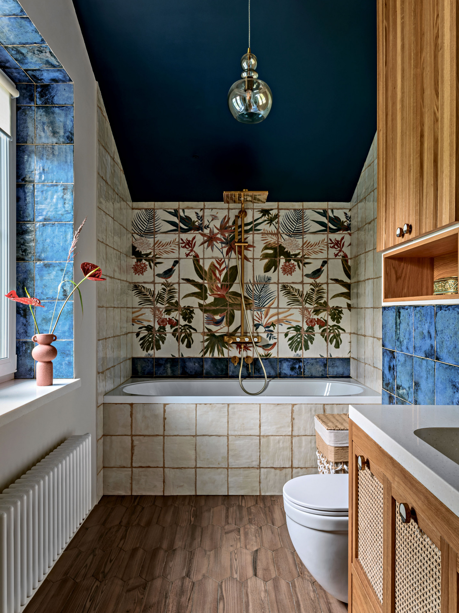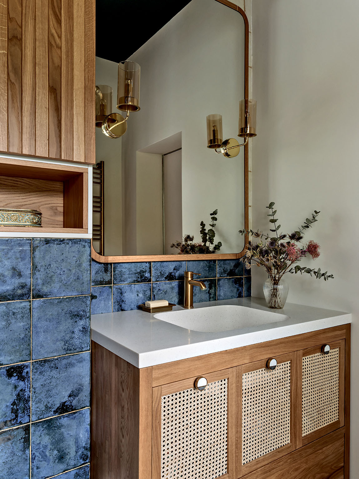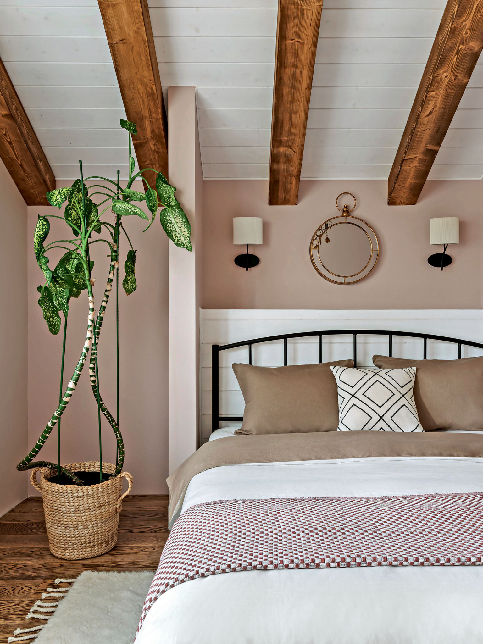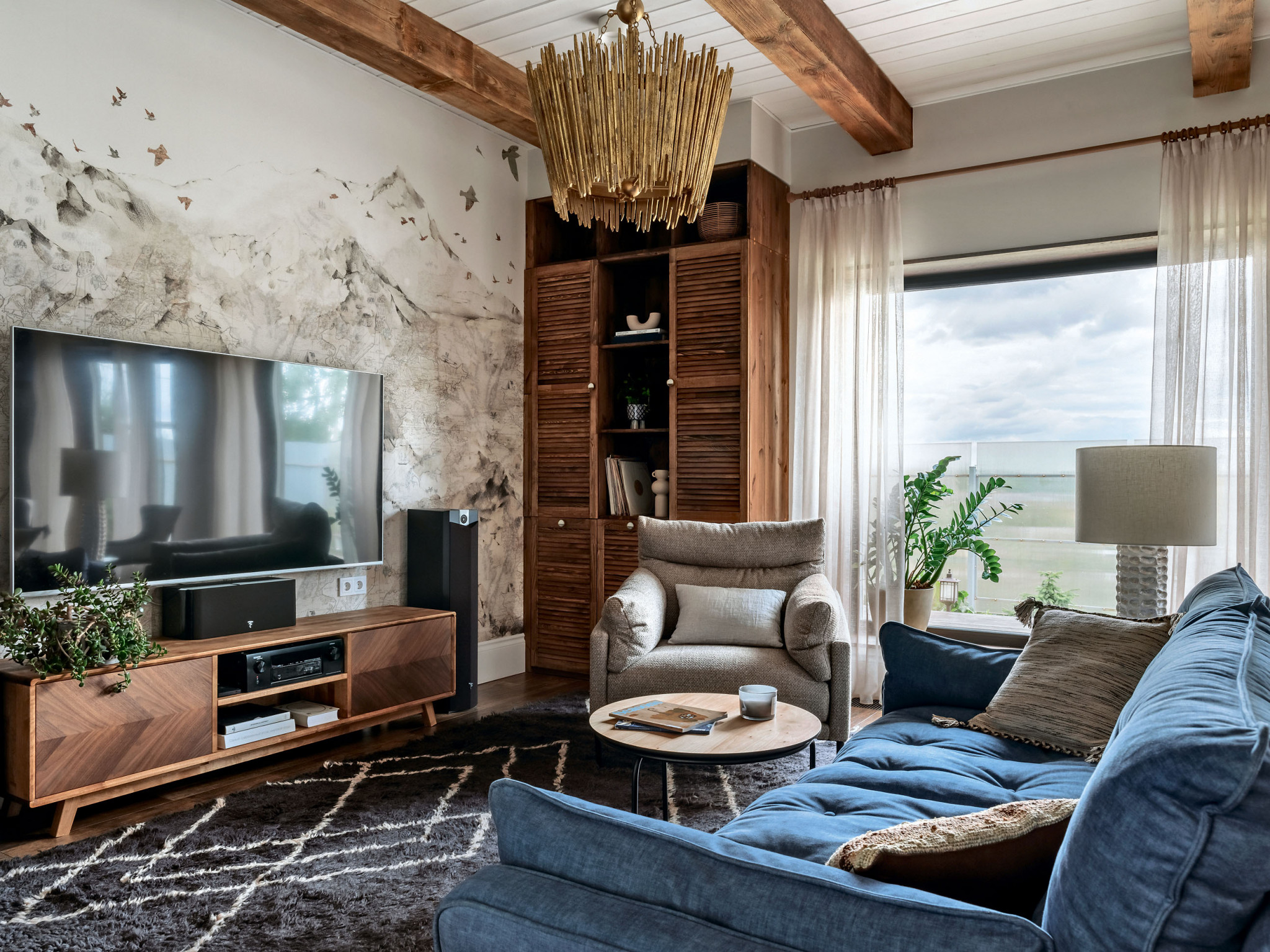Дерево, керамика, ротанг, джут, бамбук, хлопок и лён. Натуральные материалы поддерживают тему природы в интерьере, одновременно участвуют в формировании атмосферы дома и отвечают за единство стилистики. Она складывается из нескольких составляющих: что-то здесь есть от стиля кантри, что-то от альпийского шале и бохо. Тут есть и элементы сканди, но состаренного, «потёртого», и приметы уютного mid-century. Живые растения усиливают эффект деревенского дома. Заказчица относится к домашним растениям трепетно, и для каждого с большой любовью подобрала кашпо.