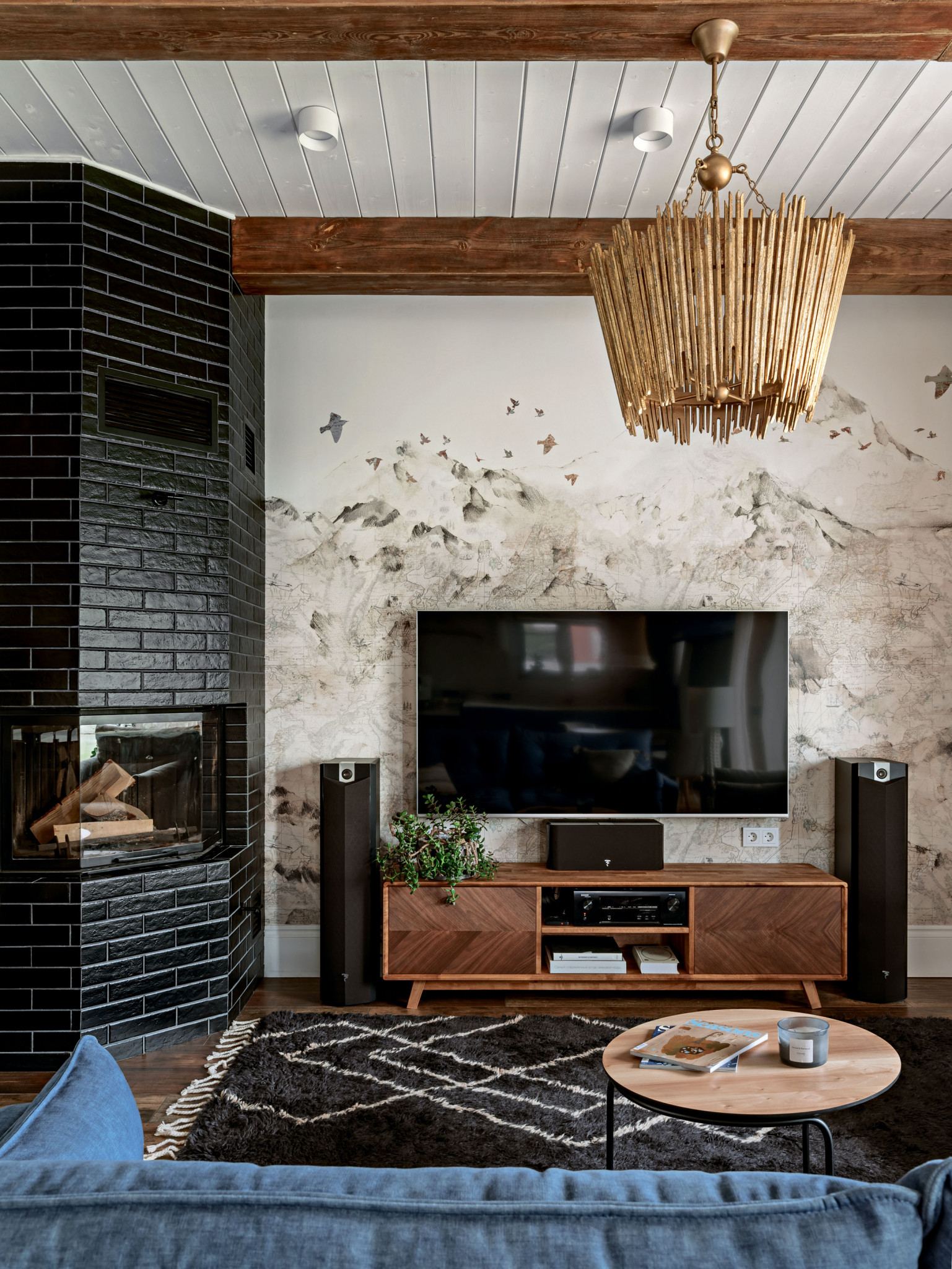 Атмосфера загородного уюта сочетается здесь с ощущением свободы. Тут многое сделано по авторским эскизам архитектора, и каждый элемент декора несёт скрытый смысл. Например, тема гор раскрывается нелинейно: и реалистически — в панно над диваном, и в абстрактном ключе — в «остром» орнаменте пушистого ковра и в узоре плитки на фартуке кухни. В интерьере заложена способность к развитию, и ему повезло с хозяевами. Так, эти творчески одарённые люди уже после завершения работы с Анастасией Струве самостоятельно создали зону отдыха на втором этаже, точно попав в стиль.