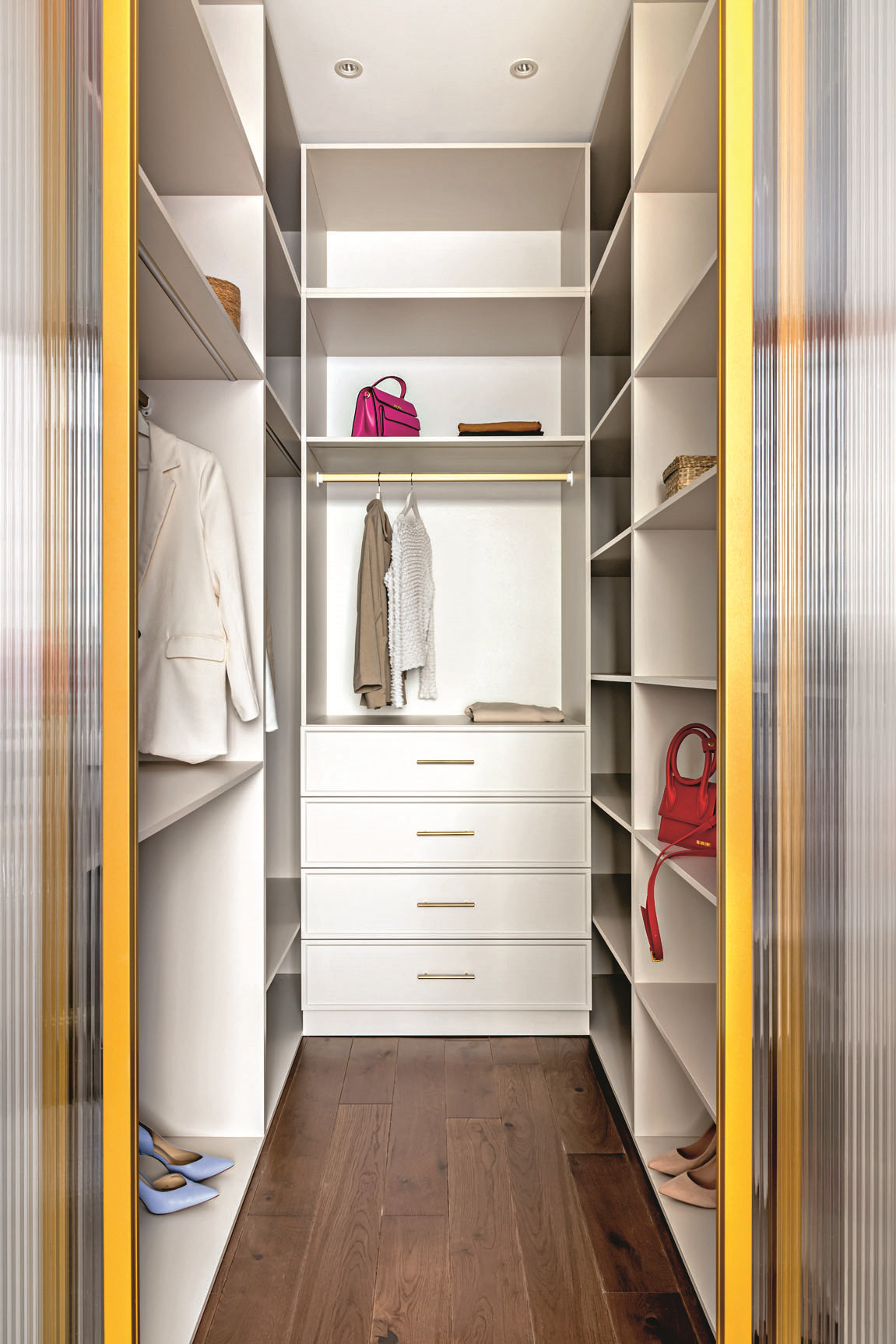 Перепланировка. Между небольшой прихожей и гардеробной возвели стену, чтобы высвободить место для установки большого шкафа во входной зоне. Вход в гардеробную перенесли в спальню. Дверной проём в комнату разместили под углом 45˚, что дало возможность сделать траектории движения более плавными и визуально присоединить пространство прихожей к общему объёму кухни-гостиной. Дверное полотно установили зеркальное — для усиления эффекта.