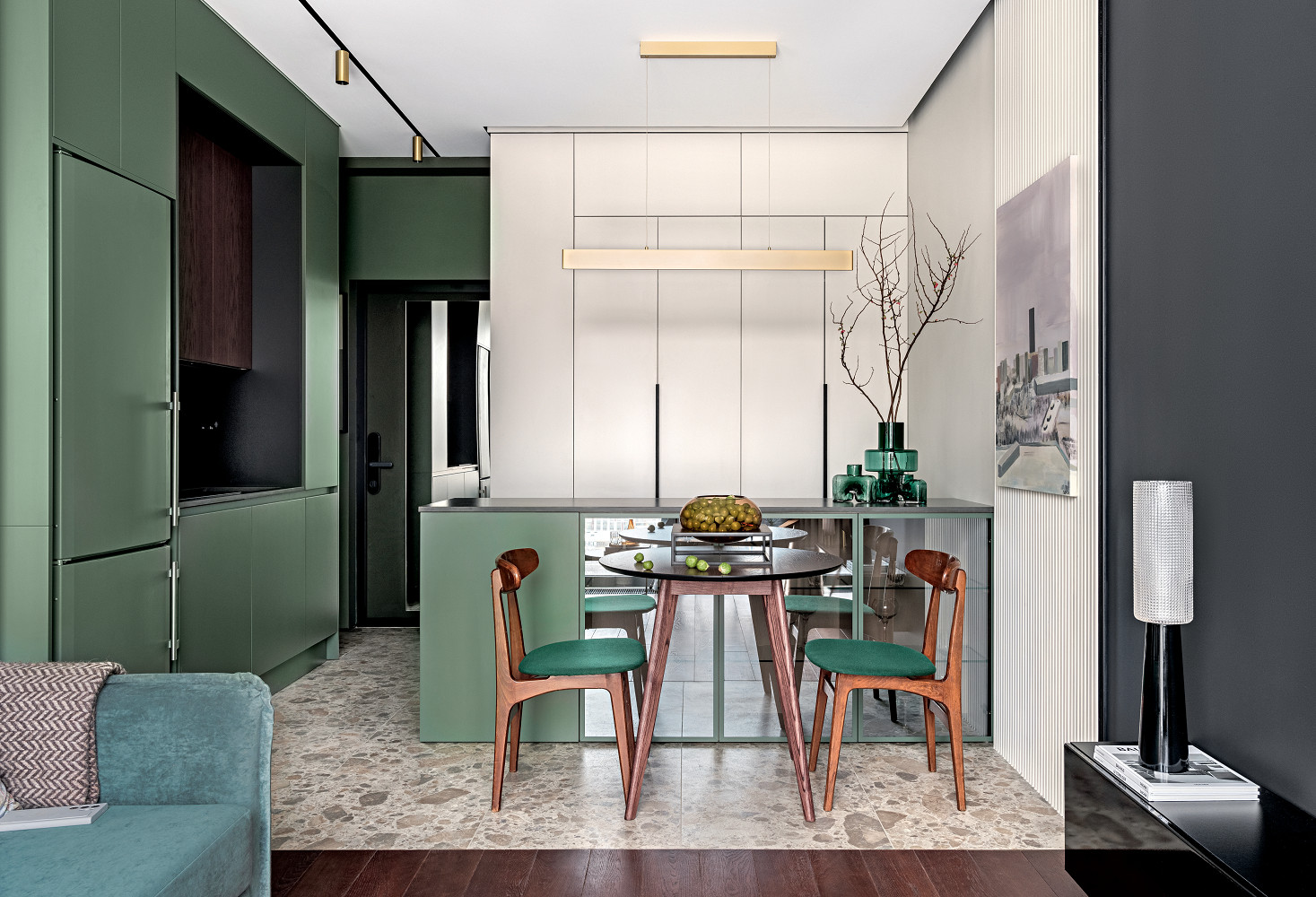 Перепланировка. Квартира сдавалась застройщиком без перегородок. Из общей зоны с помощью пазогребневых блоков выделили санузел, между спальней и гости ной сделали лёгкую стеклянную перегородку. Дизайнер хотела, чтобы наслаждаться видом за окнами можно было из любой точки пространства. С другой стороны, требовалось отделить жилую зону от входной и скрыть от посторонних глаз частную жизнь обитателей апарта ментов. Поэтому кухонный блок немного сместили к цен тру оси двери — так он перекрывает вид на гостиную и спальню. Однако, очутившись внутри, можно смотреть в окно, готовя еду, завтракая на барных стульях у острова, обедая в обеденной зоне или сидя на диване в гостиной.